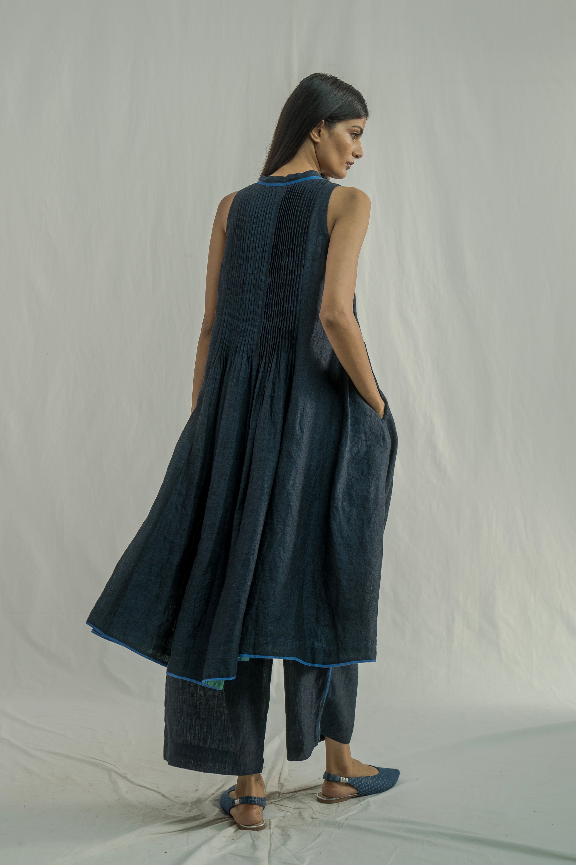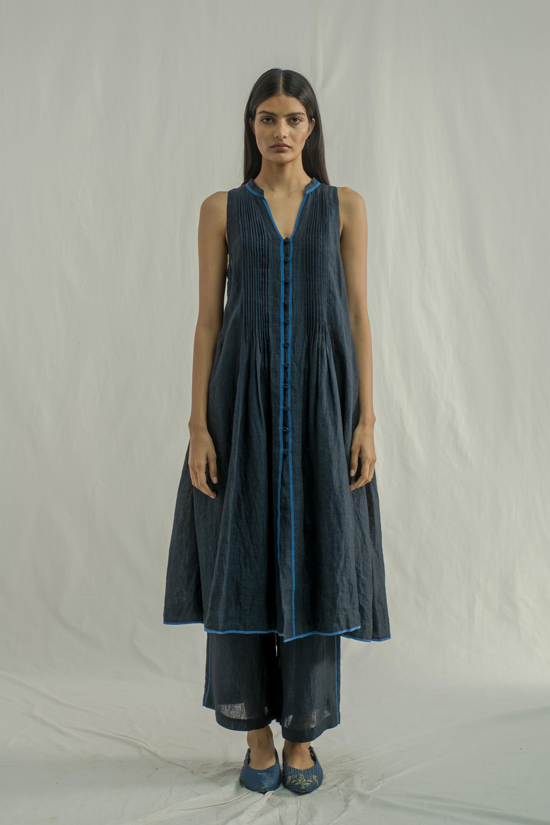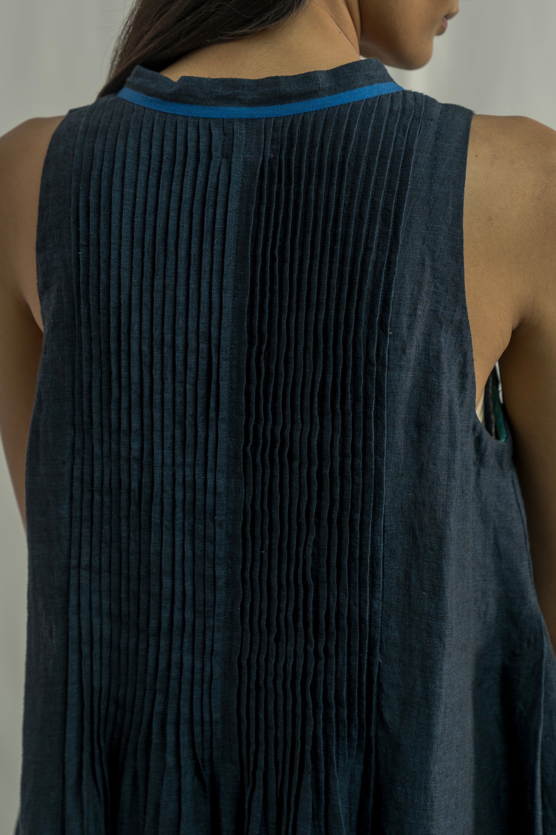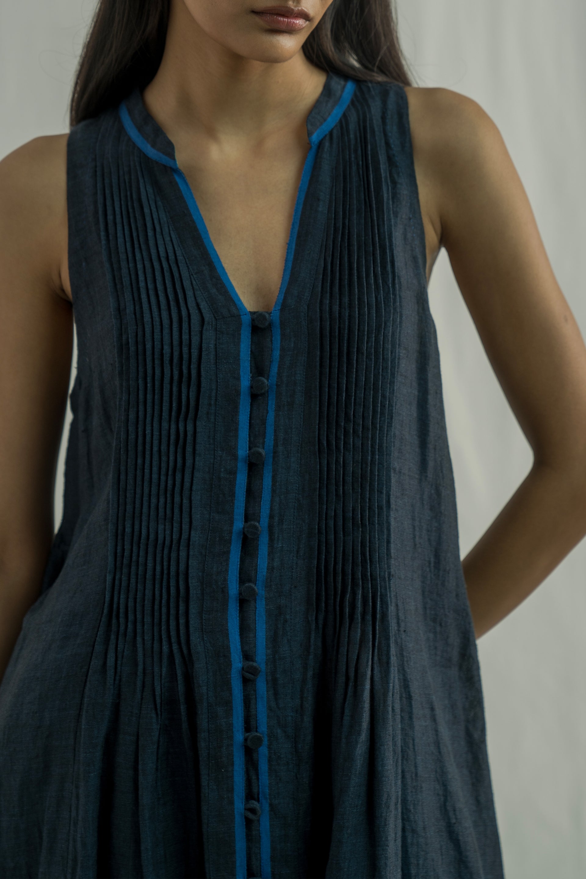 A sleeveless midi dress with a front-button down and collar, featuring pintuck detailing on the bodice and contrast selvedge accents on the placket and hem. Crafted from solid 100% linen.