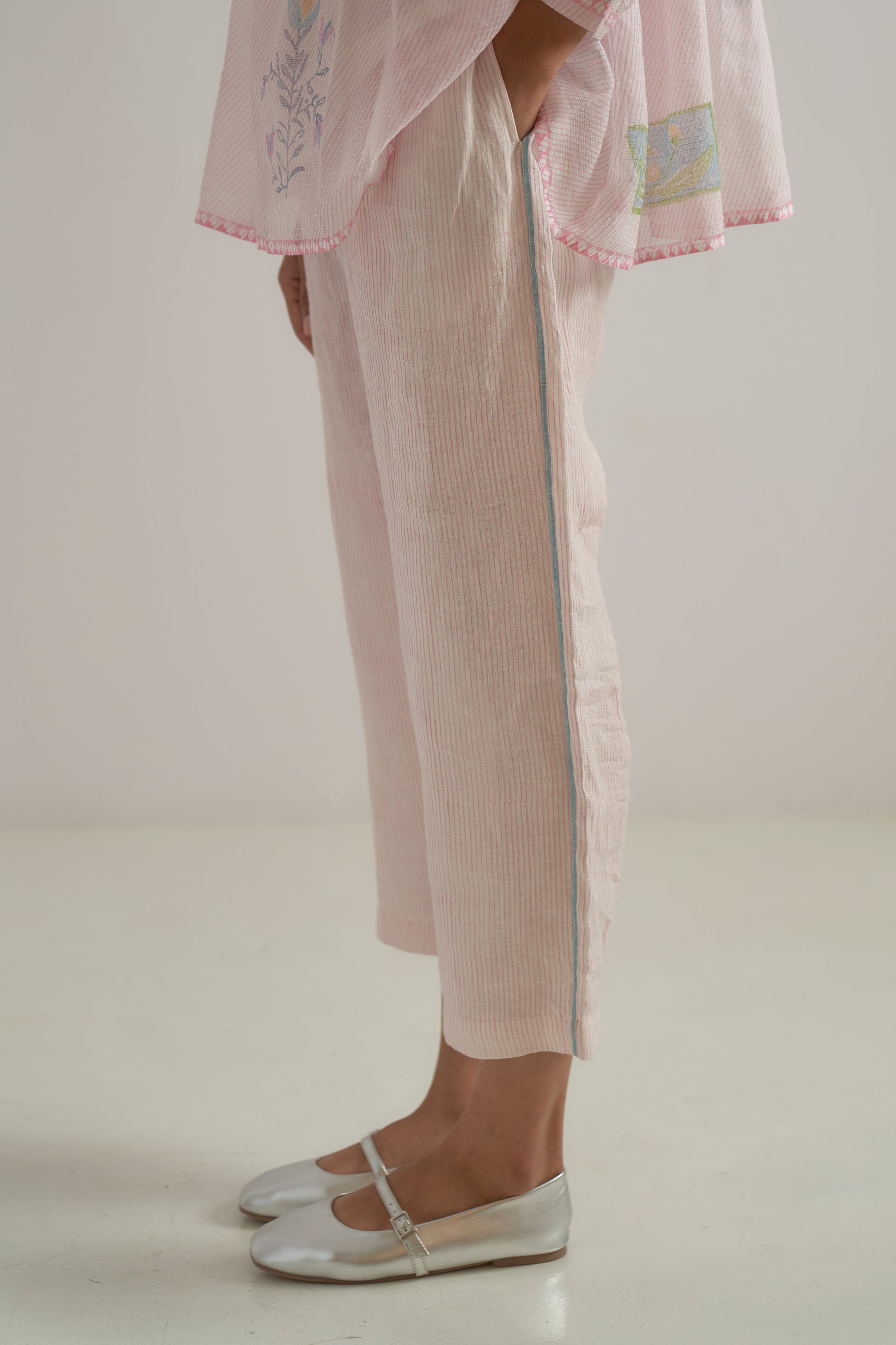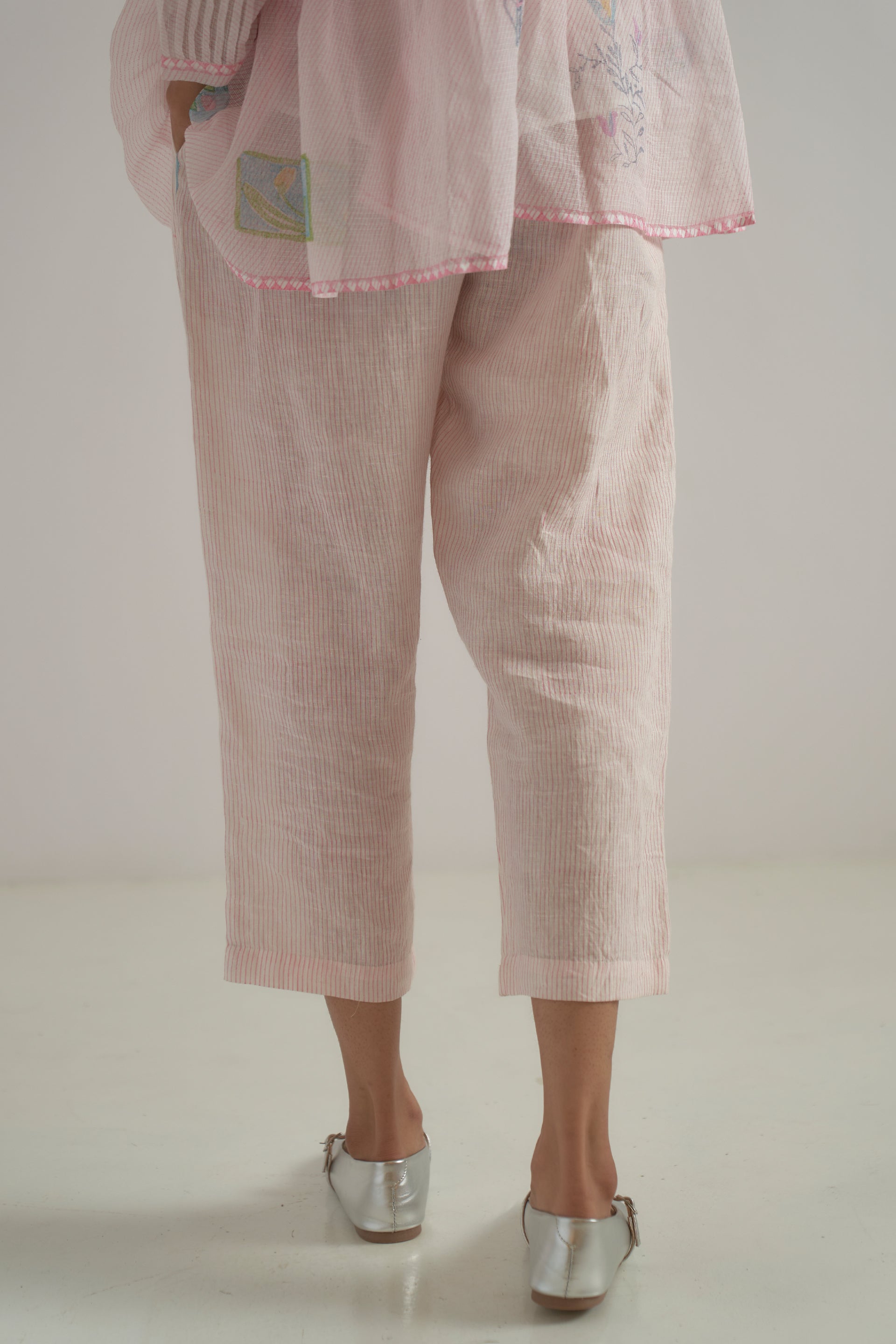 Straight-fit linen pants crafted from a pink fine striped hand-block print base