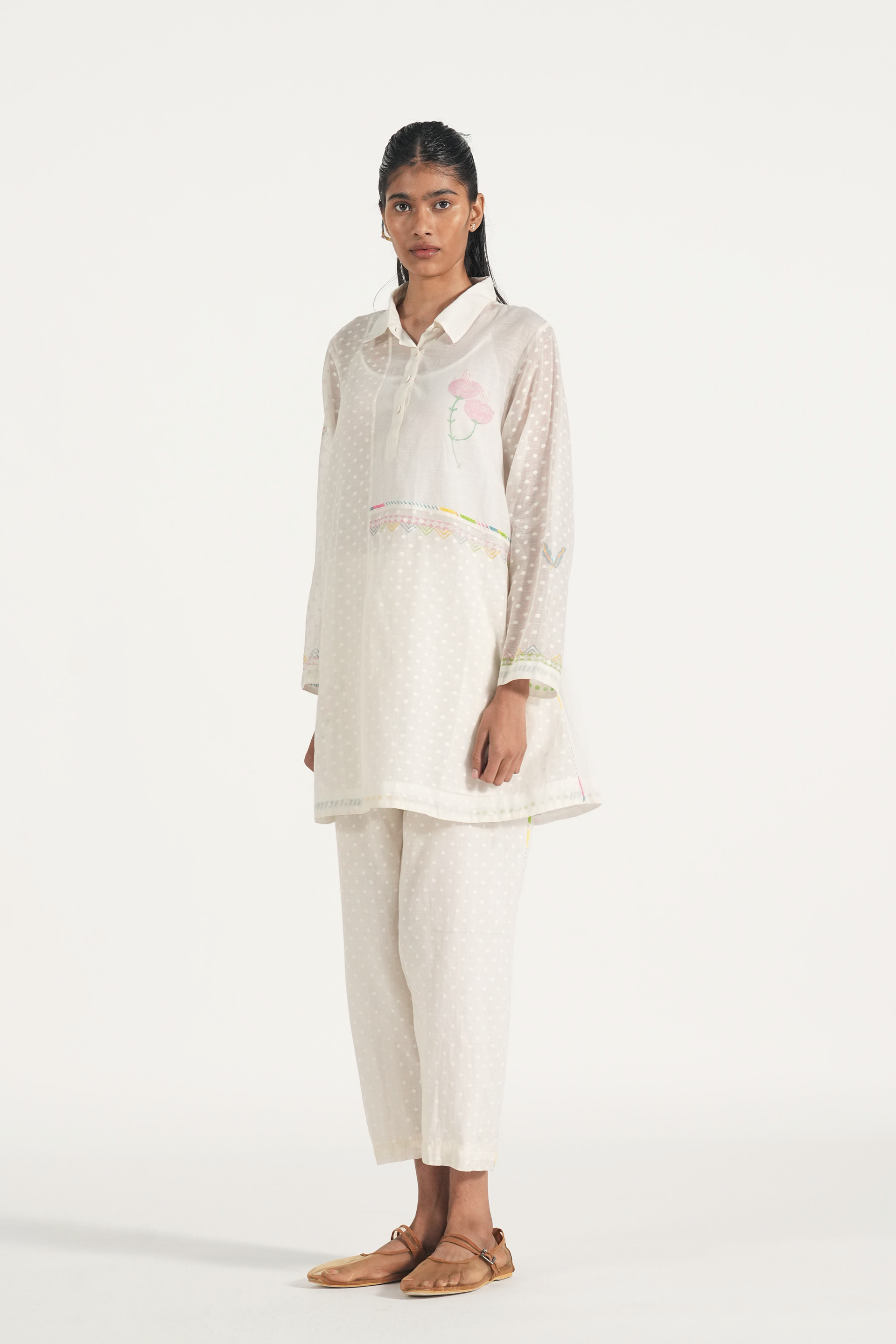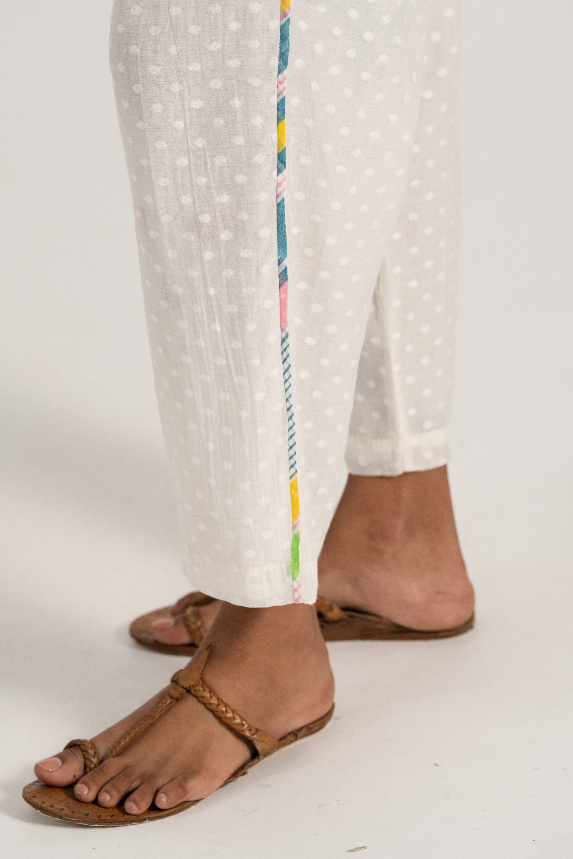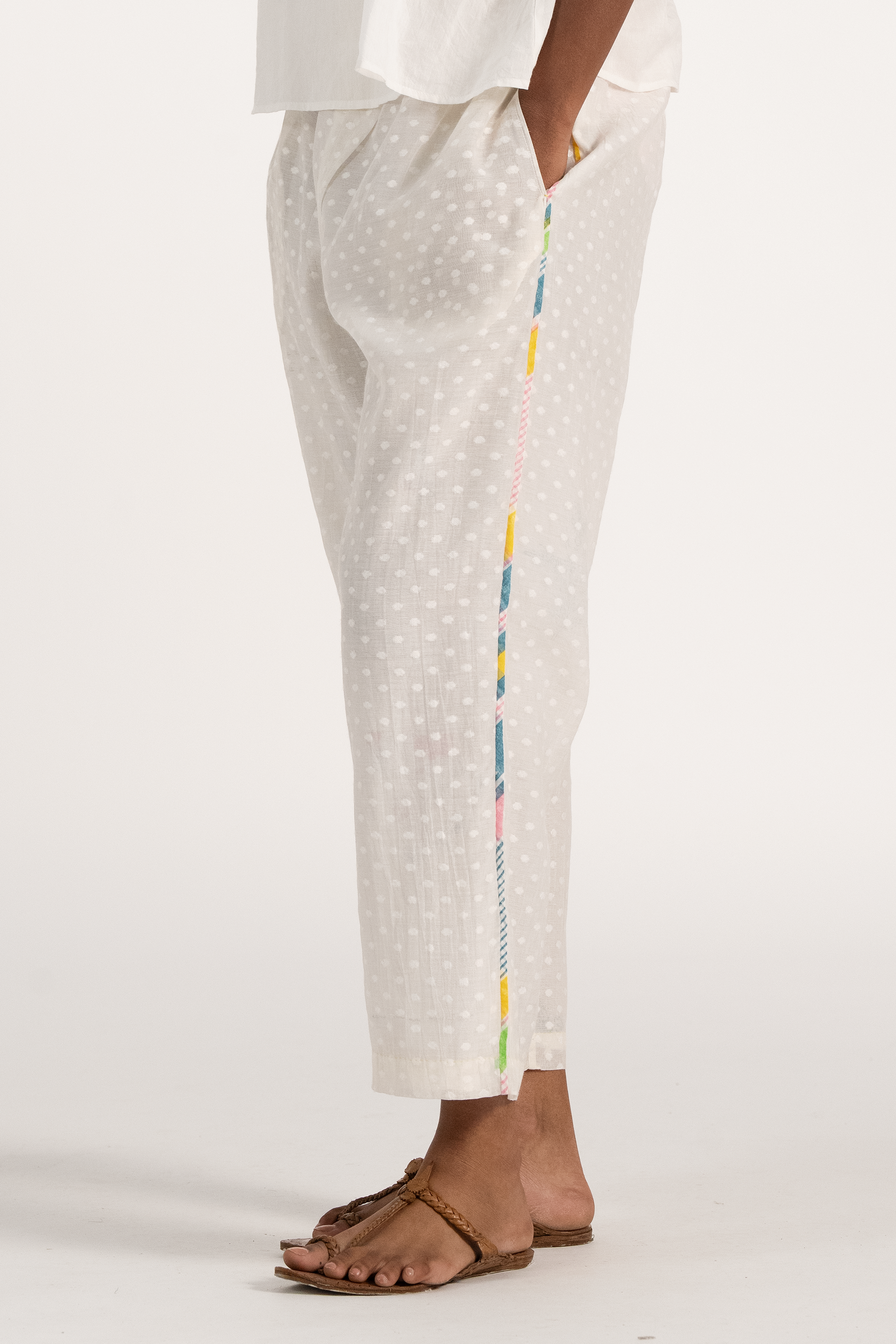 Straight fit pants in hand block printed polka dots with multicolor block print binding on the side seams.