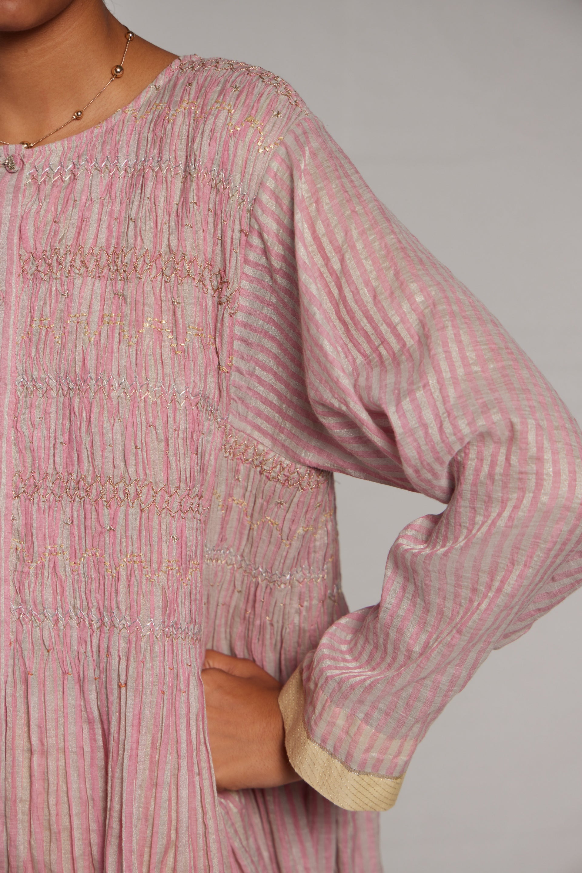Front open button down dress in handloom cotton silk and zari stripes with contrast zari quilted border detail on hem and sleeves. Finished with exquisite hand smocking at the front and metallic gota seams. Comes along with an attached printed kota doriya lining. Semi fitted flare midi length dress. 3 cm length of border in sleeves and hem.