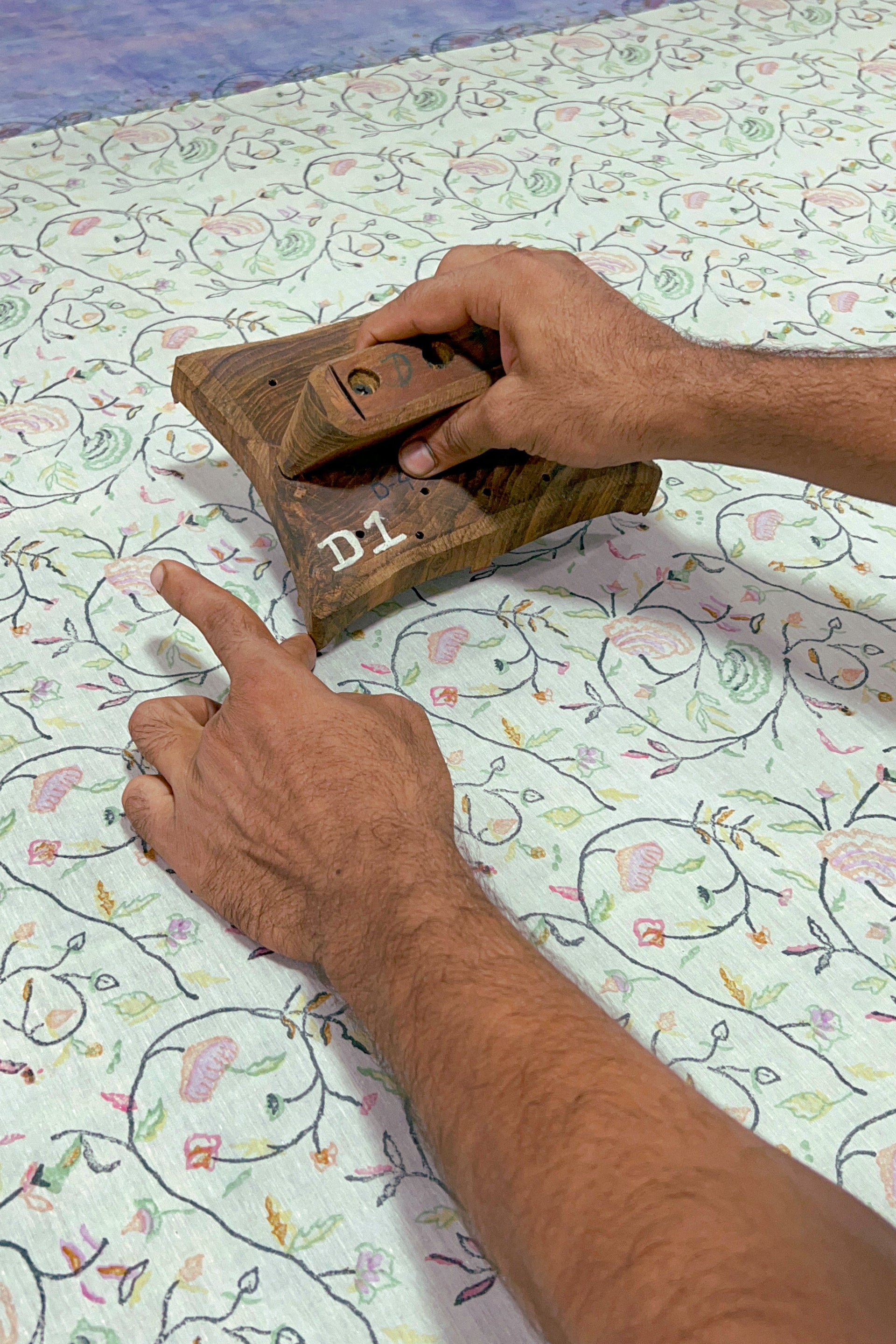 The dress is crafted with a front open, button-down dress featuring all-over hand block print that artfully combines floral, bird, and striper motifs, each element meticulously designed to create a vibrant yet cohesive pattern. This intricate smocking enhances the dress's texture, adding a subtle yet detail touch that elevates its overall aesthetic. Comes with an attached kota doriya lining.