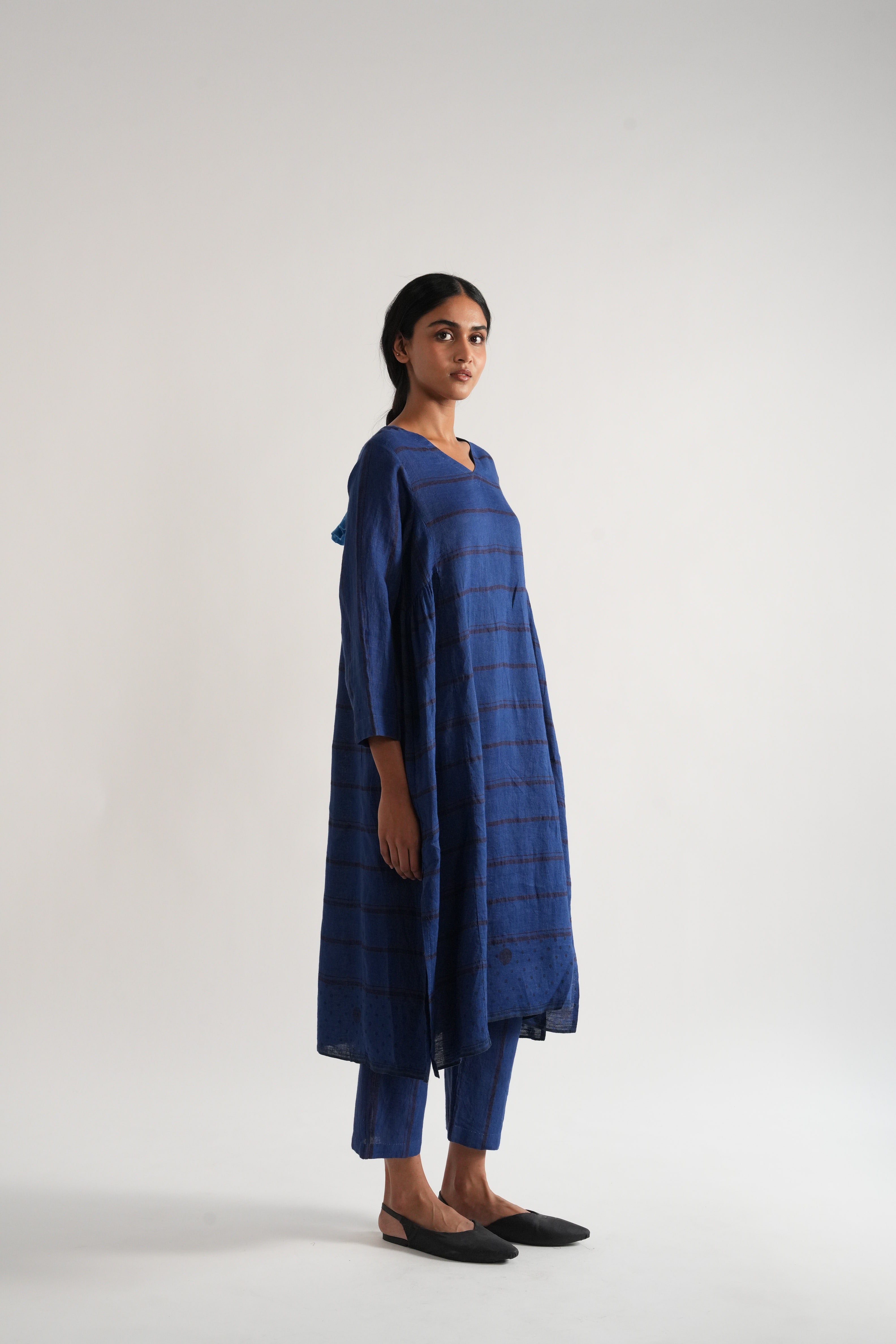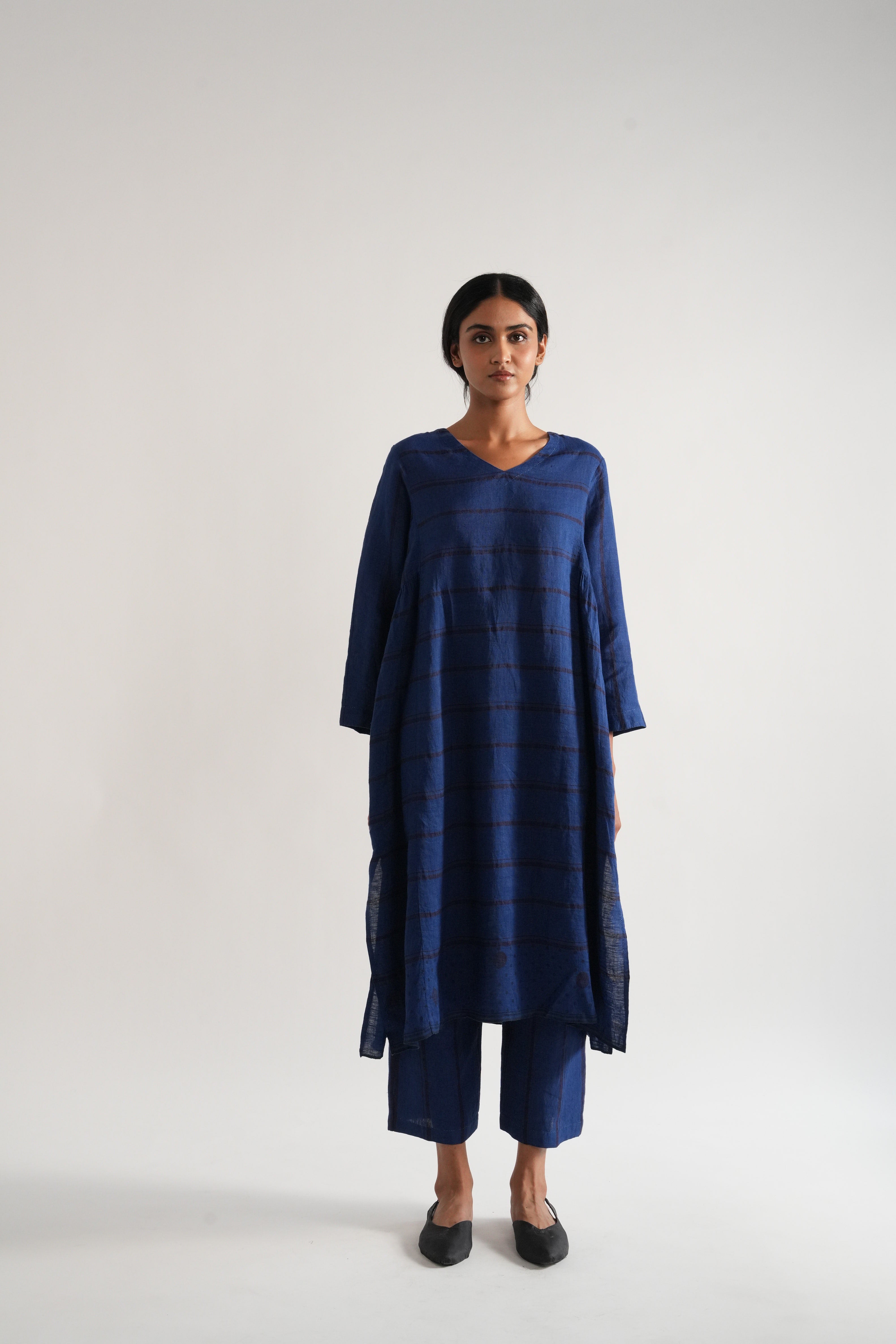 A-line tunic with v-neck in handwoven linen stripes paired with straight fit trousers