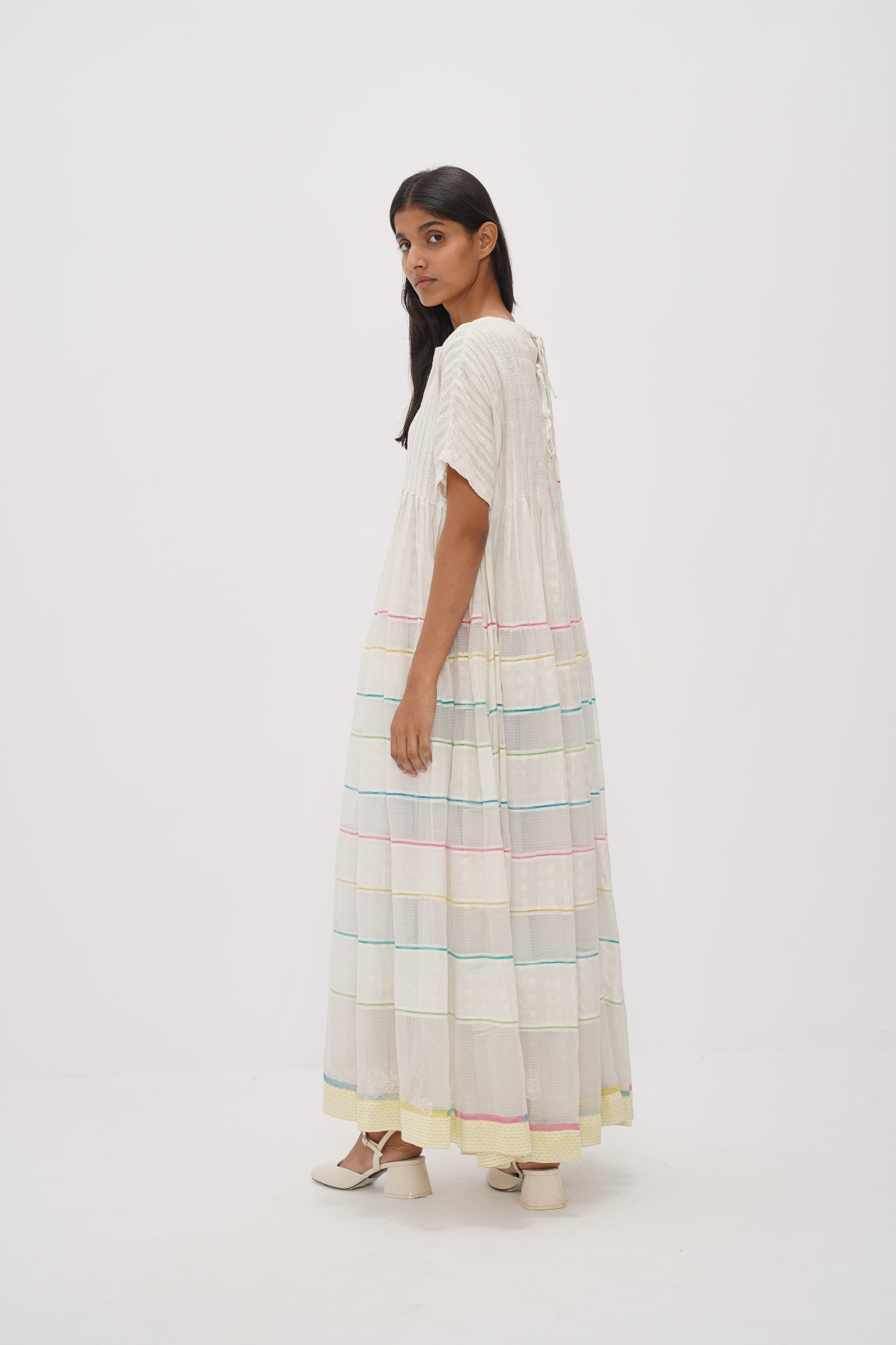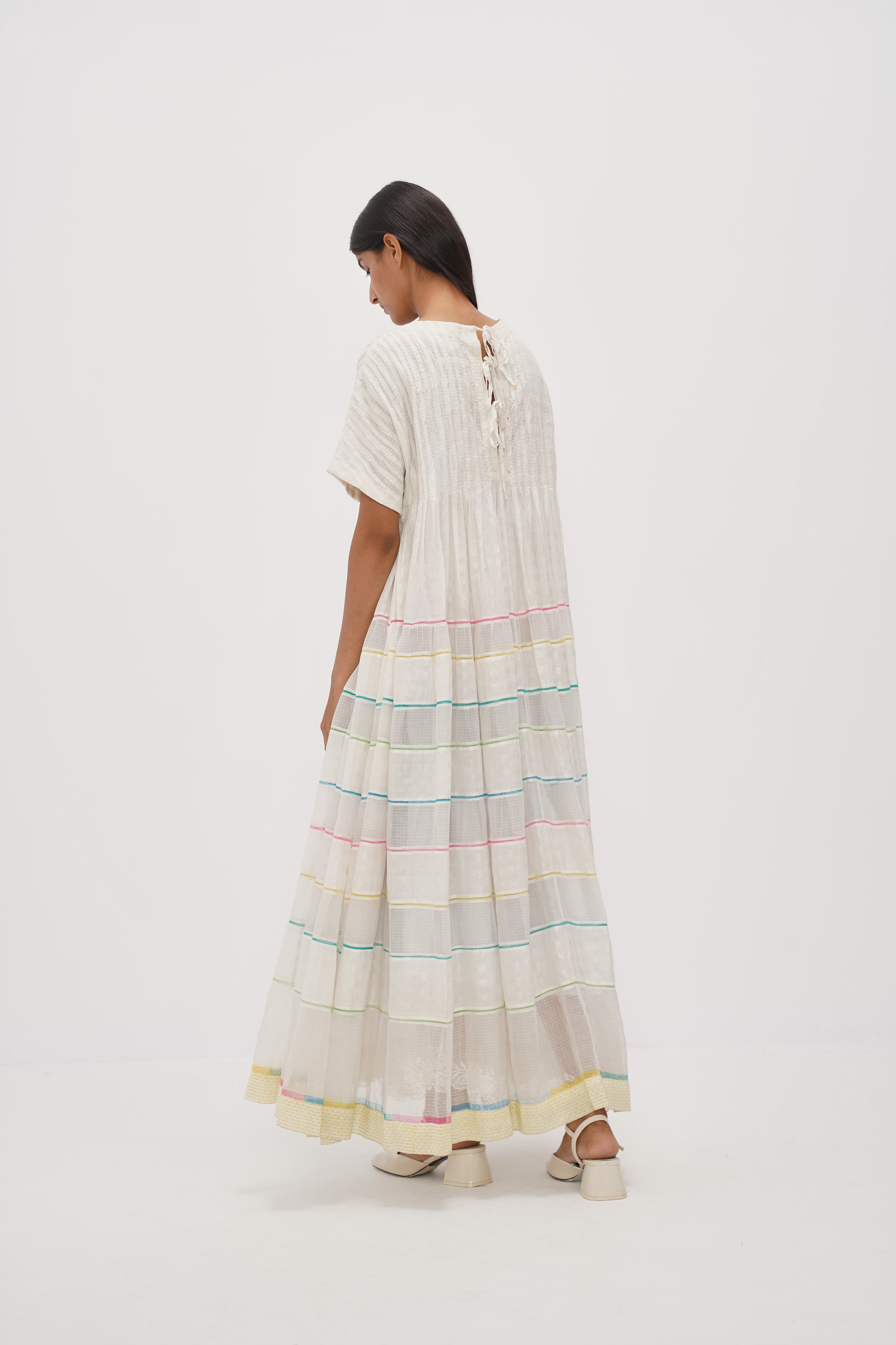 White roushed cotton silk checks and kota doriya dress with multicolor lace insert detail and multicolor floral machine and hand embroidered panel details. Comes with a separate cotton silk lining