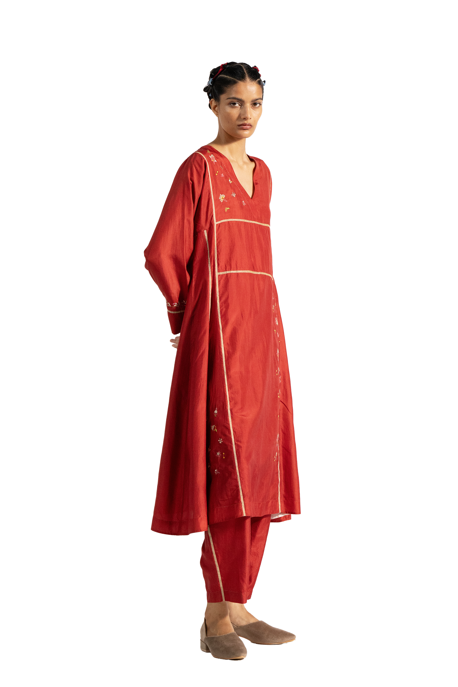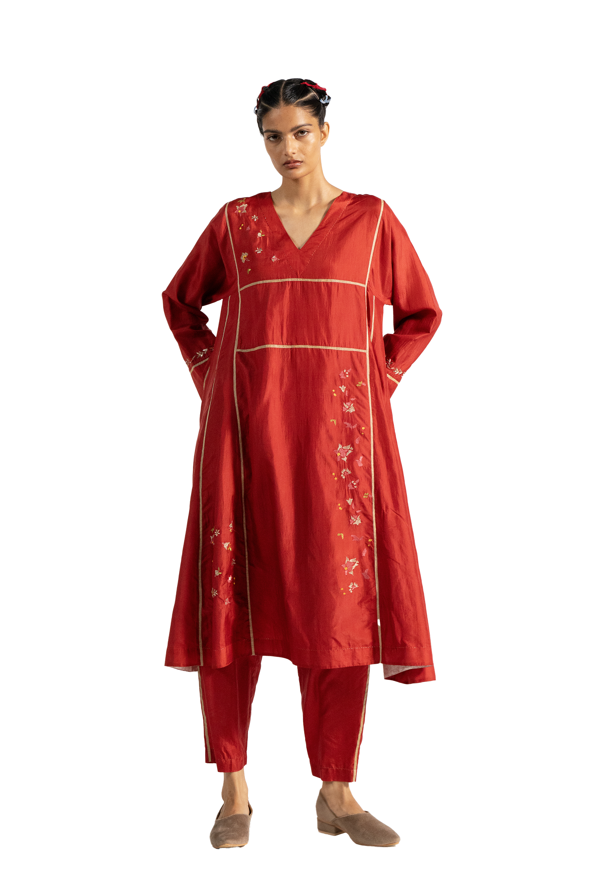 Relaxed fit kurta dress with side panels and embroidery. Comes with pleated poppy pants.