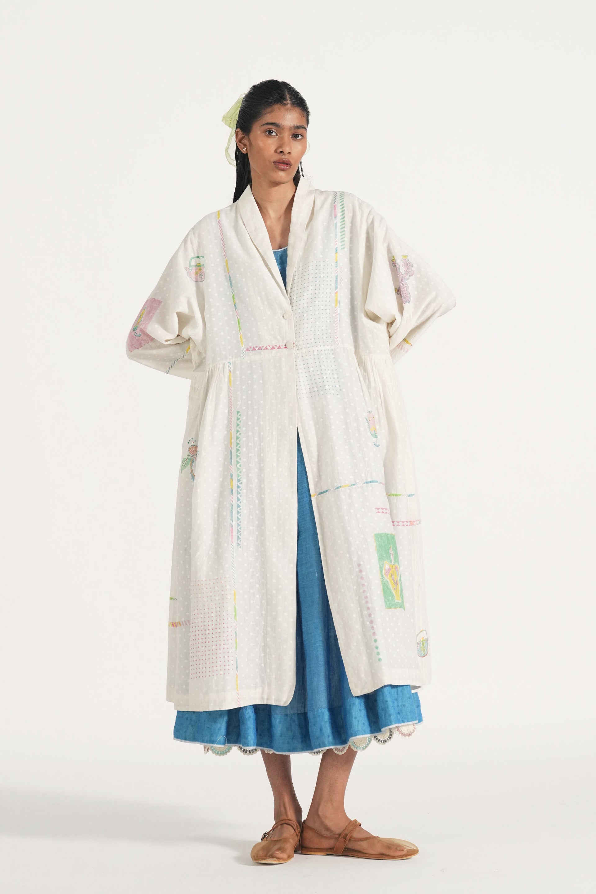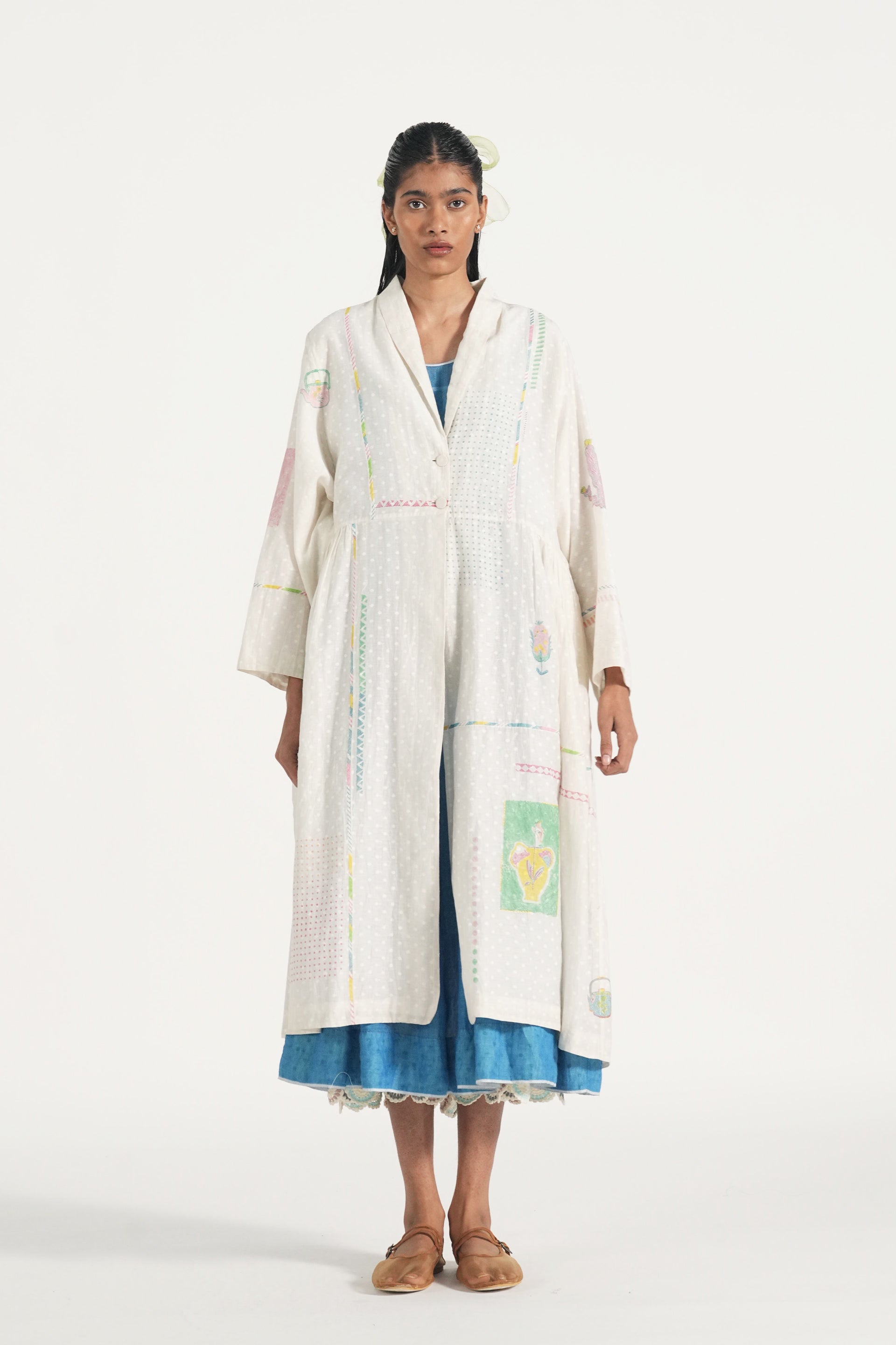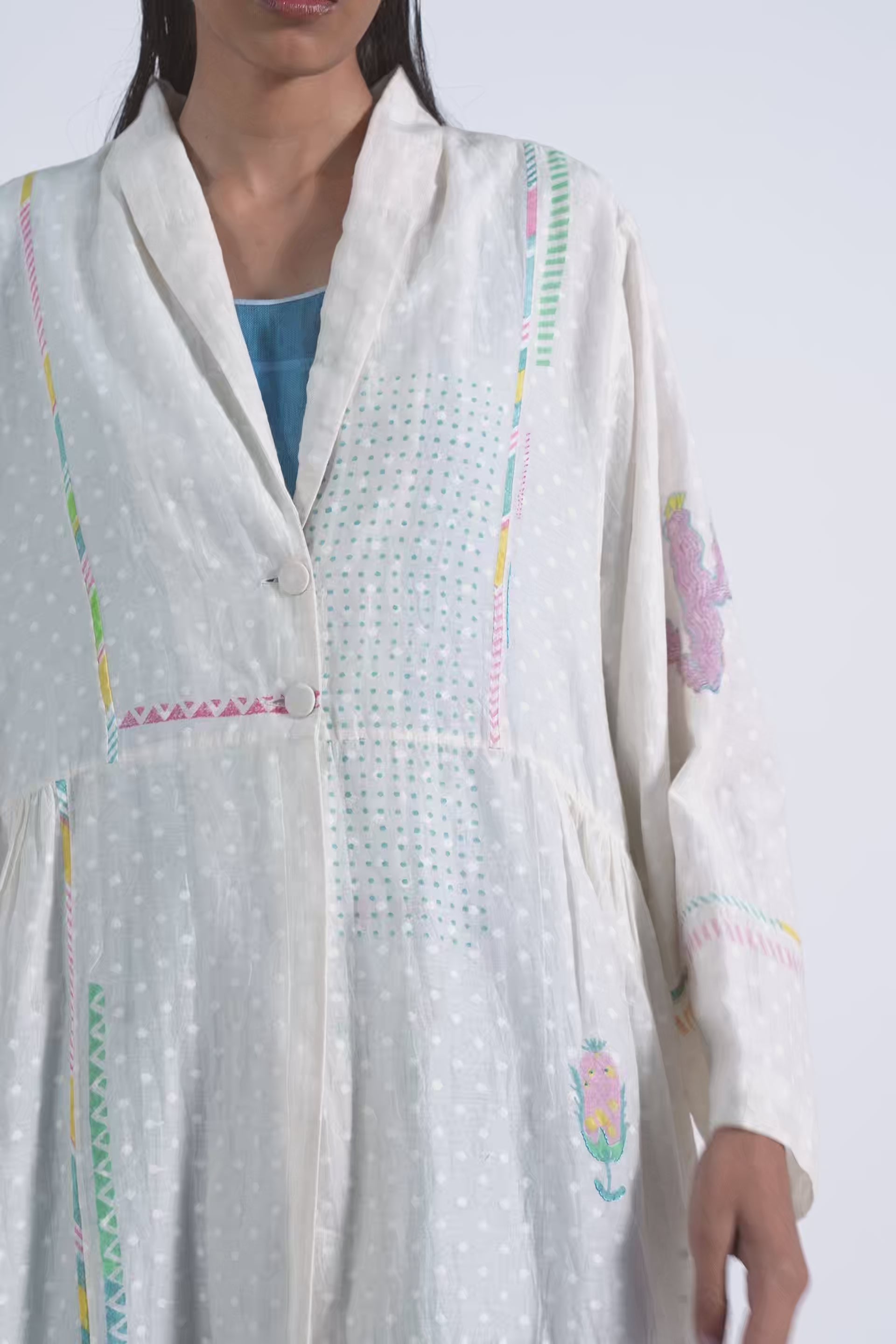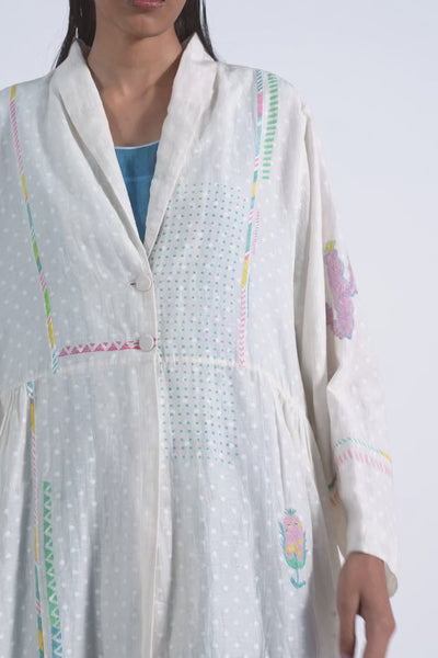 Patch stitched, engineered block printed, and hand embroidered easy fit long jacket lined with cotton lining.