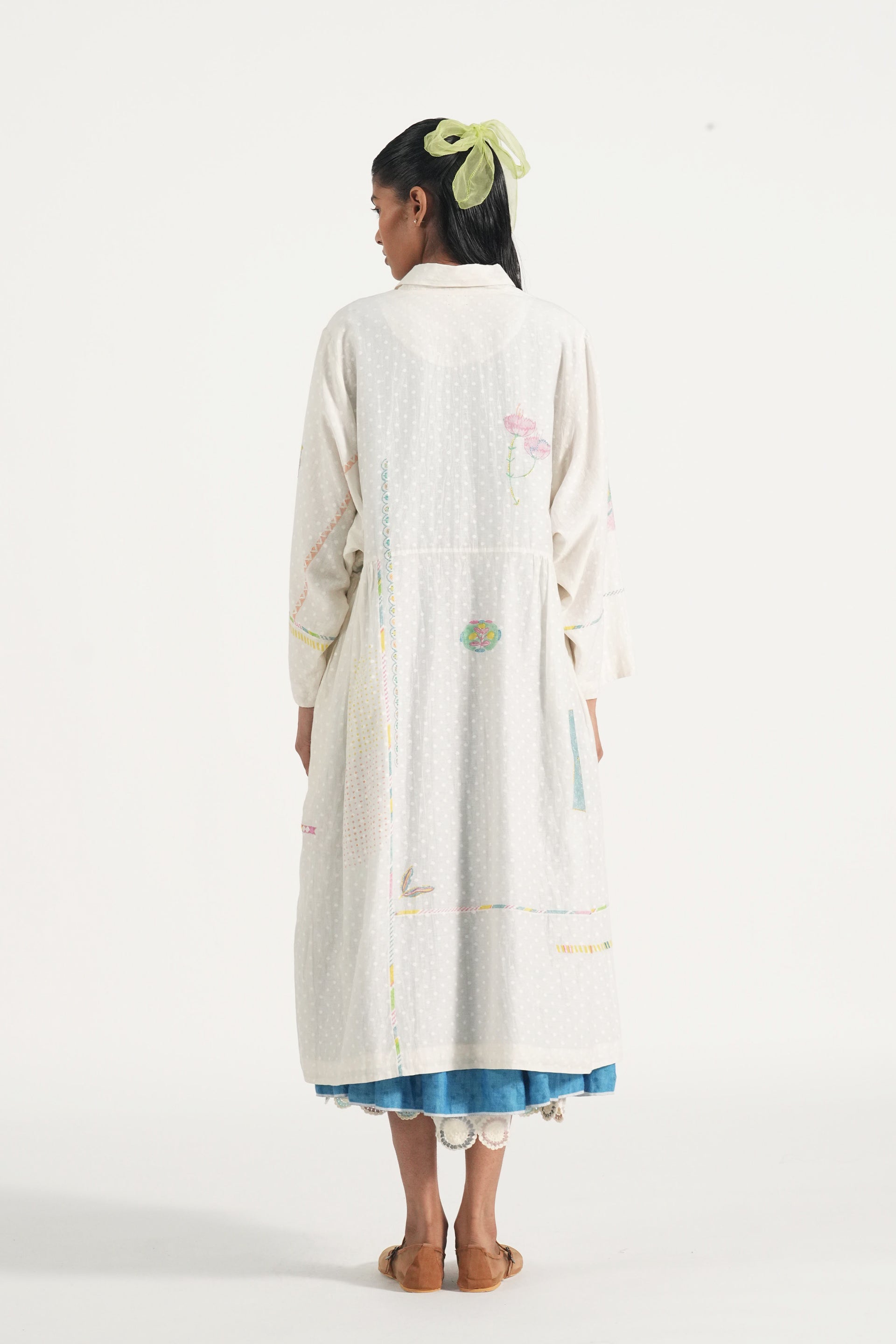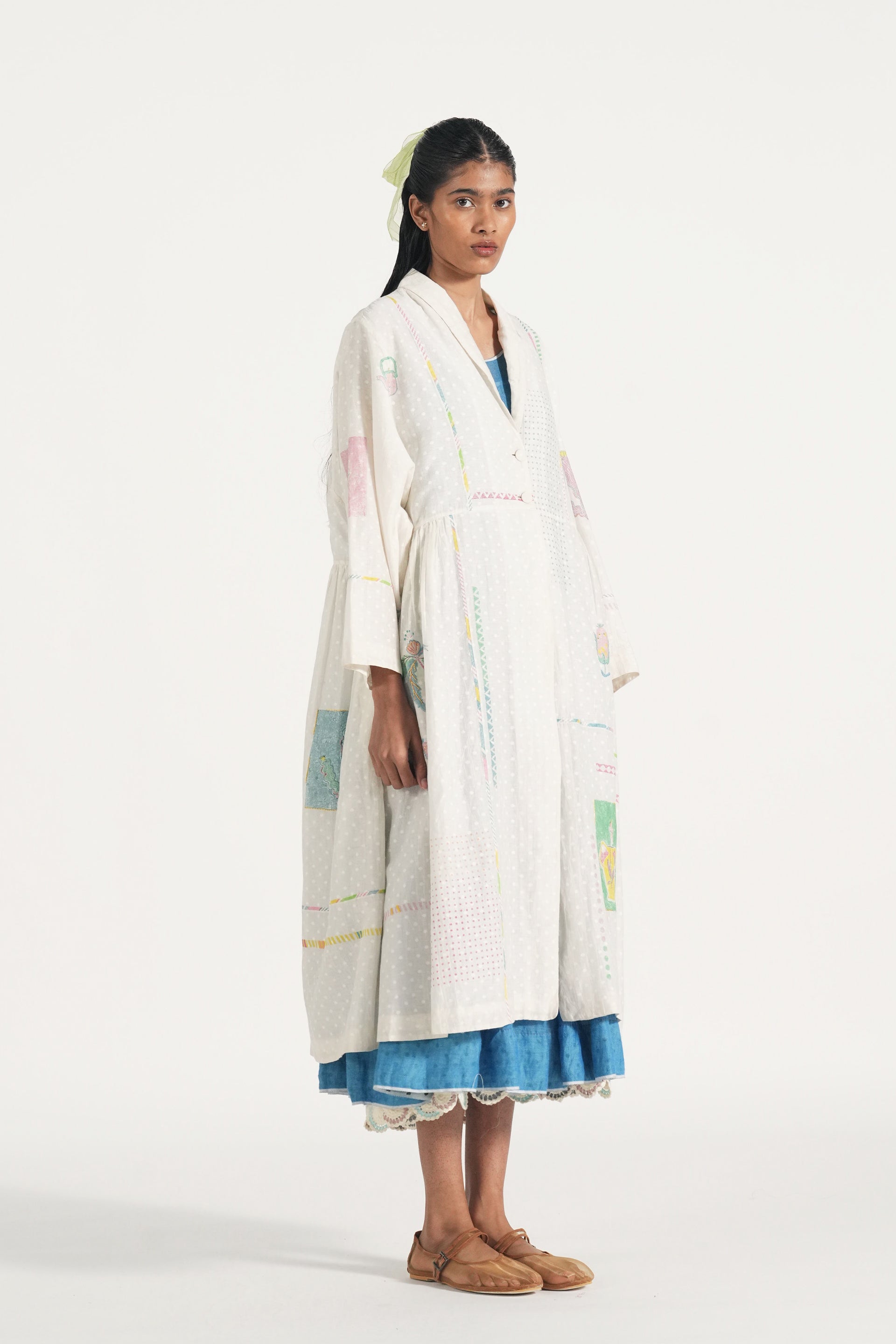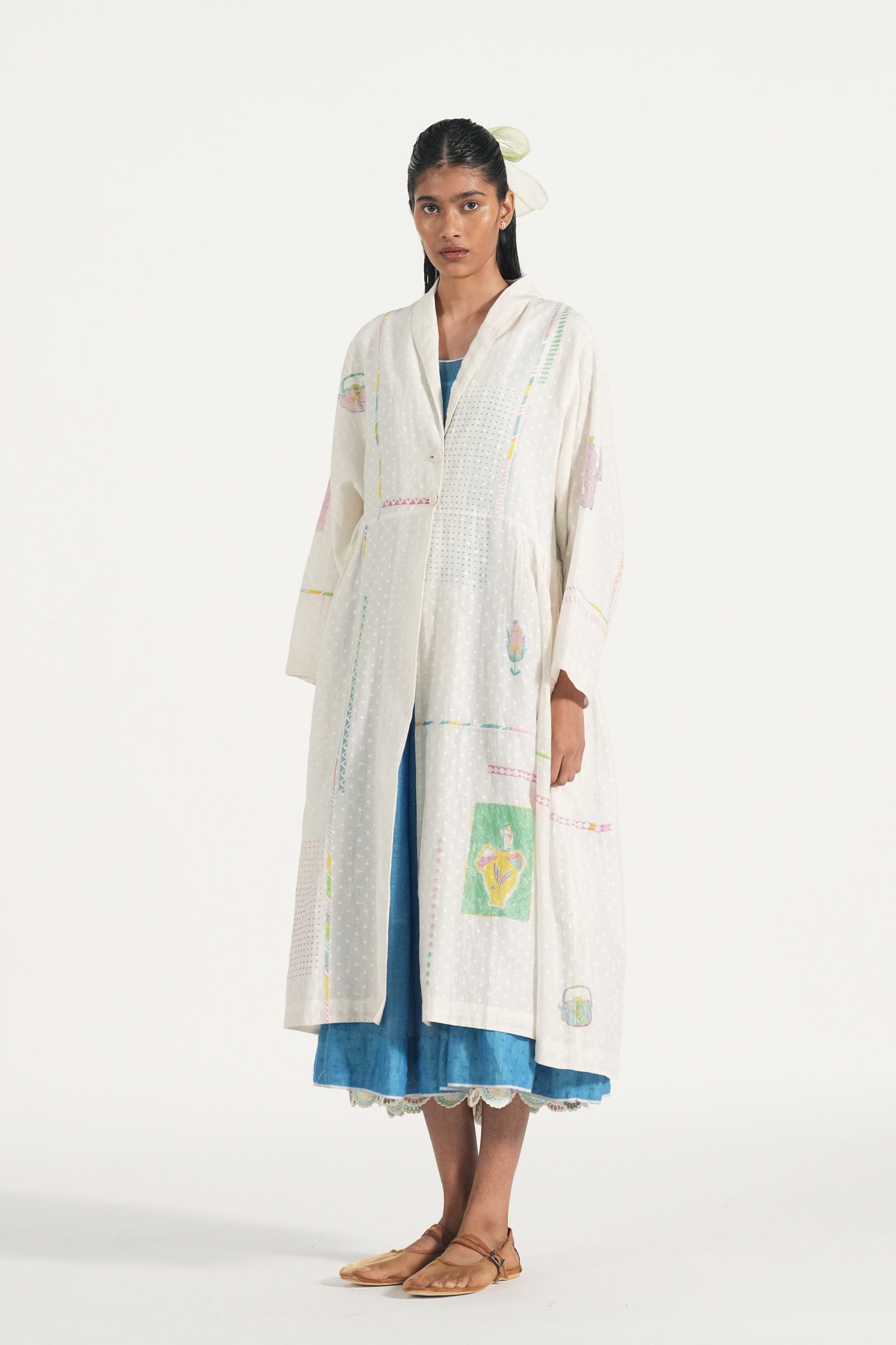 Patch stitched, engineered block printed, and hand embroidered easy fit long jacket lined with cotton lining.