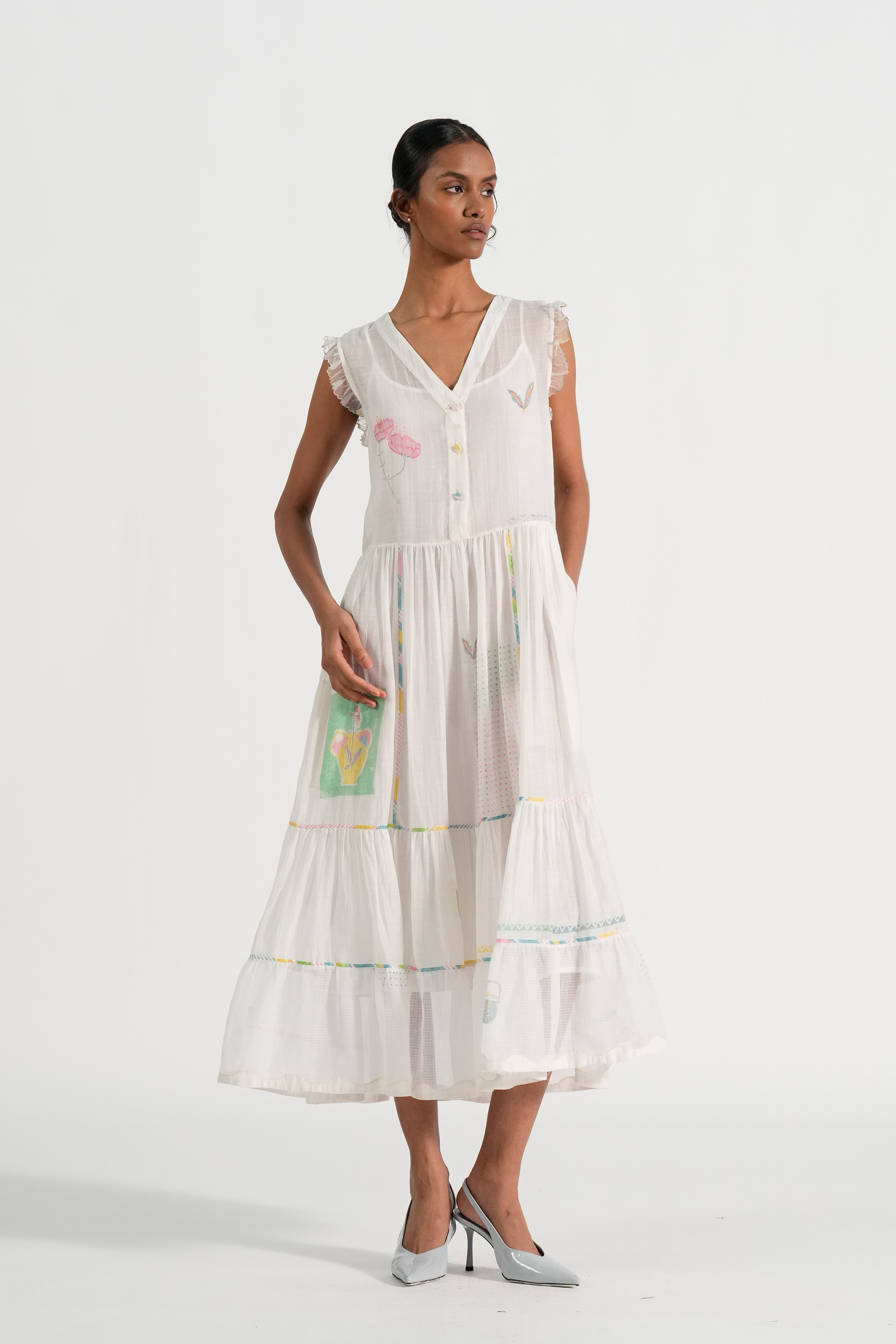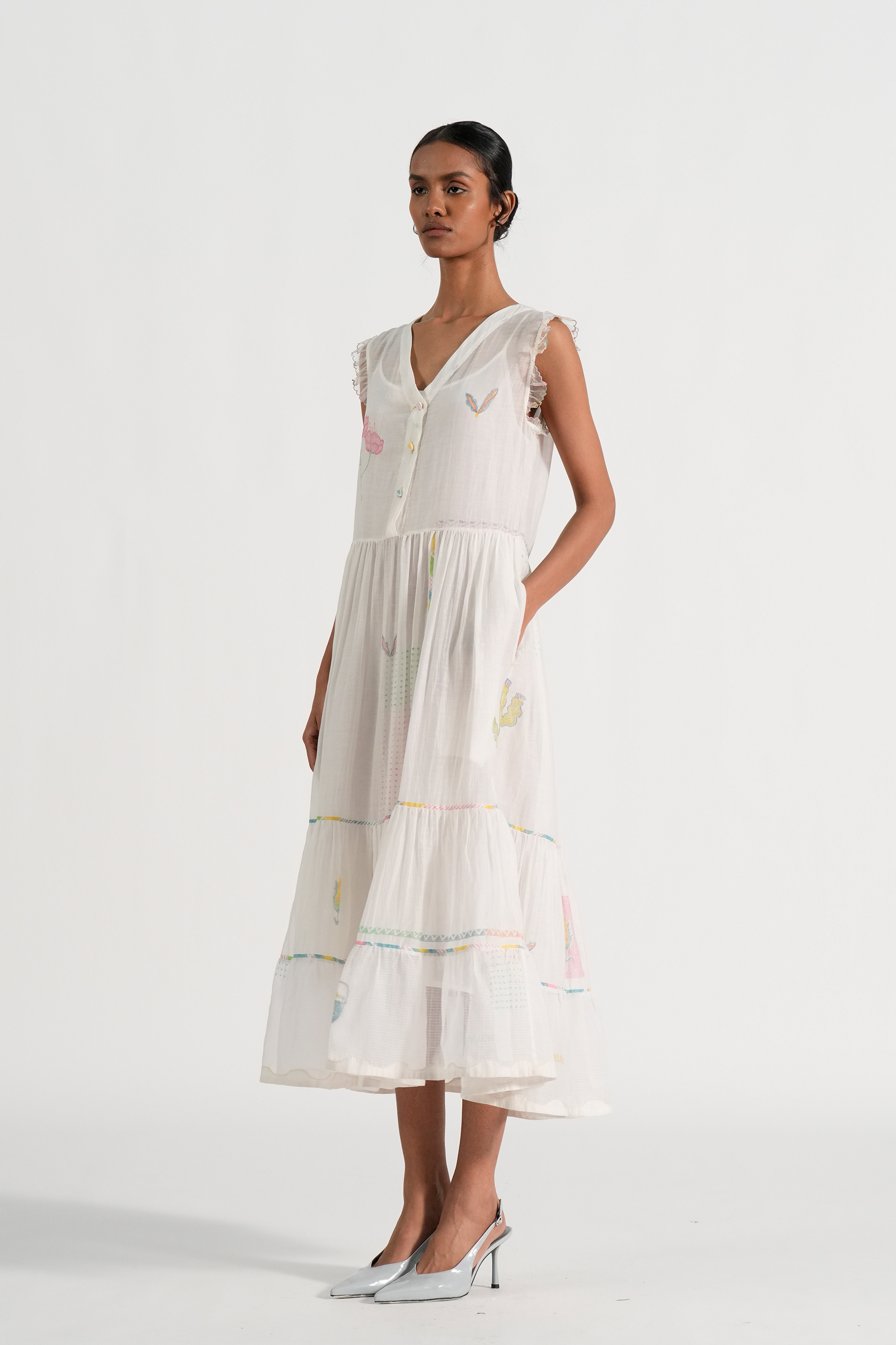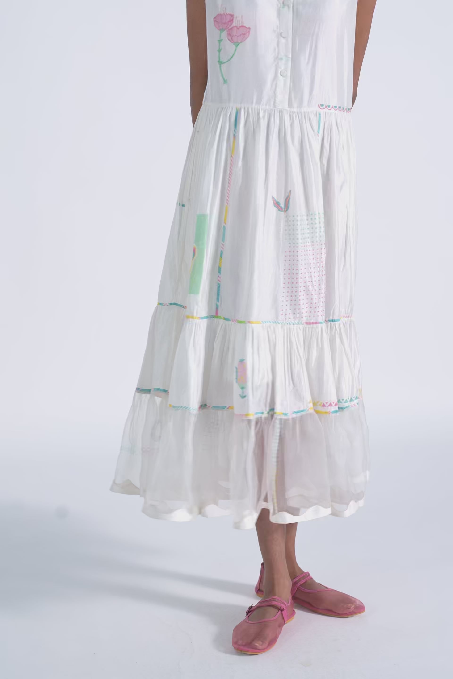 Straight fit tiered midi dress in engineered hand blocked placement motifs with hand embroidery and contrast hand blocked piping details. Comes with a complimentary plain lining, without any trim detail.