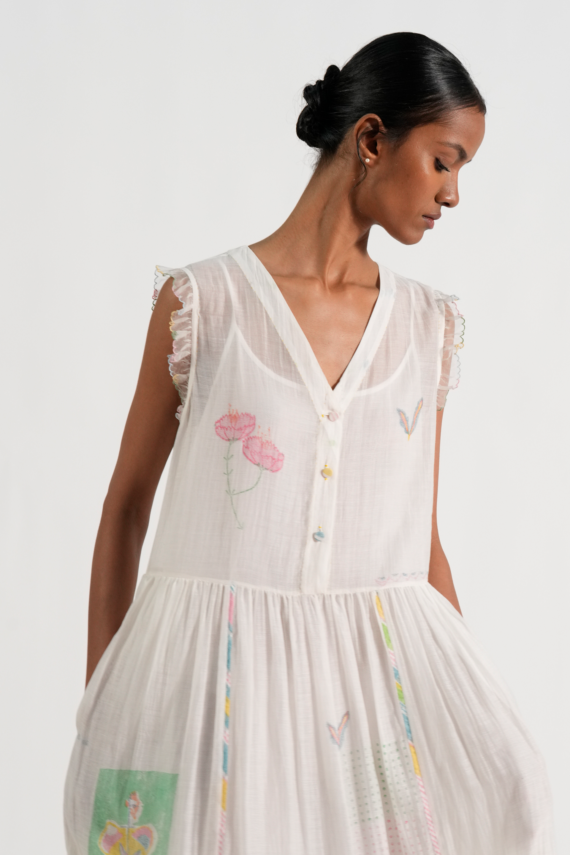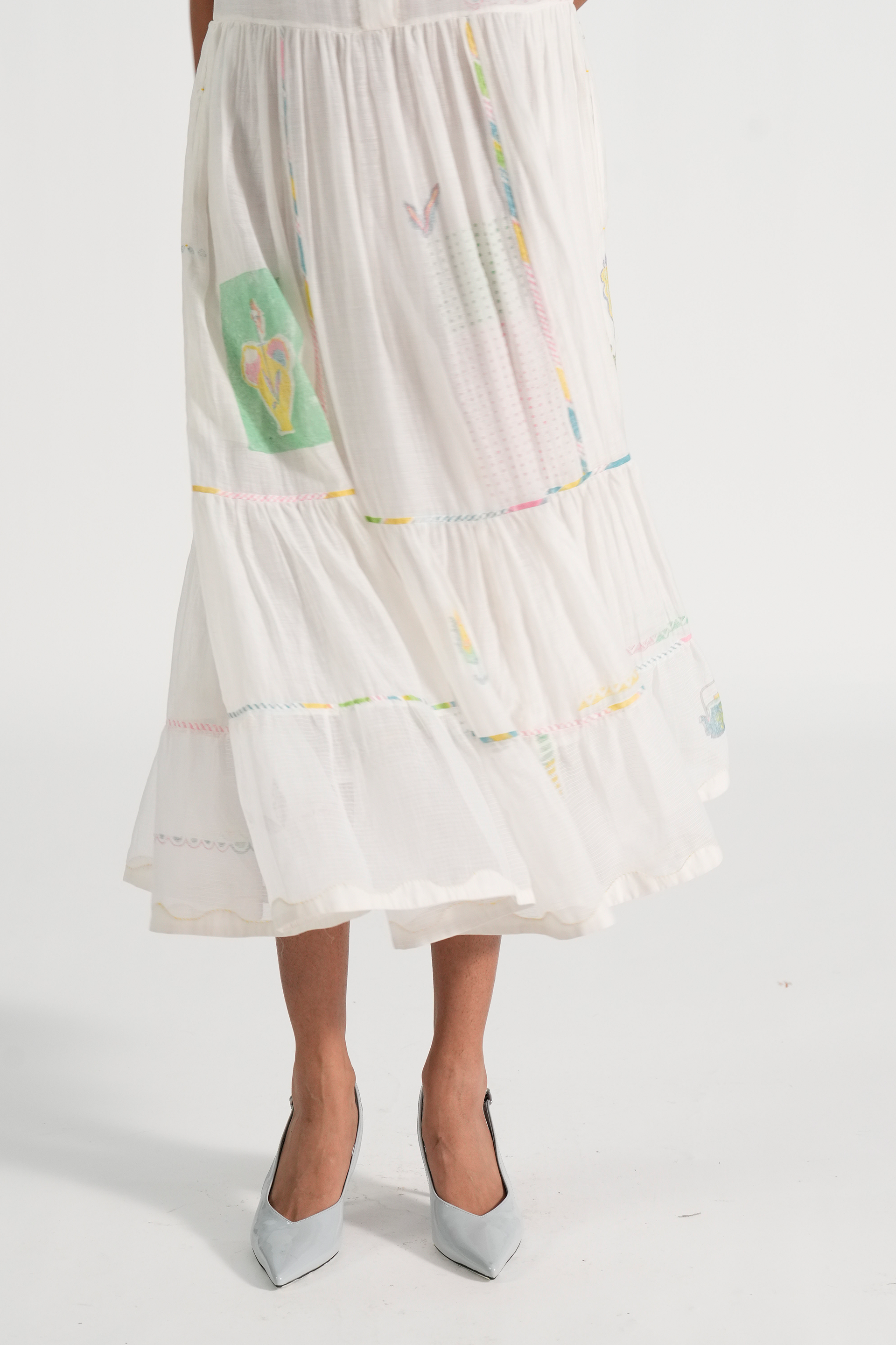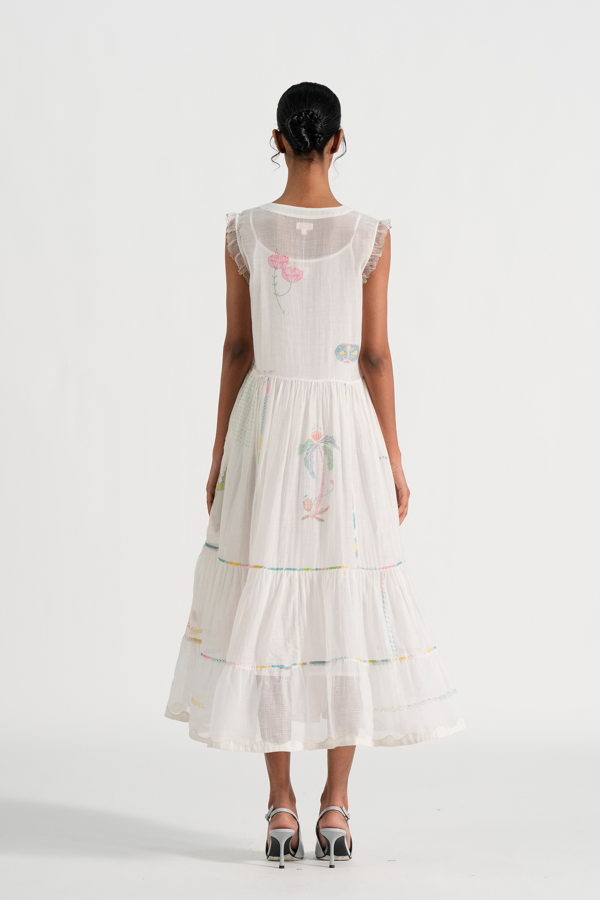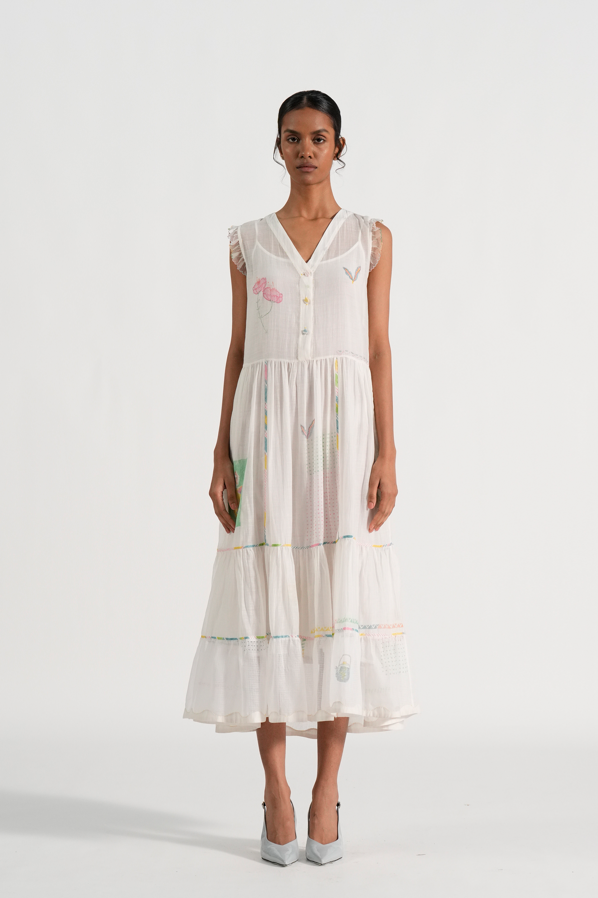 Straight fit tiered midi dress in engineered hand blocked placement motifs with hand embroidery and contrast hand blocked piping details. Comes with a complimentary plain lining, without any trim detail.