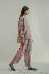 Stand- collar straight fit front open button down shirt with full sleeves. Constructed in multicolor striper 100% linen fabric.
