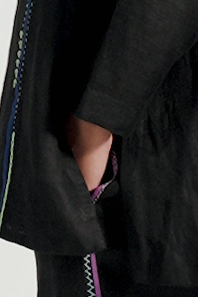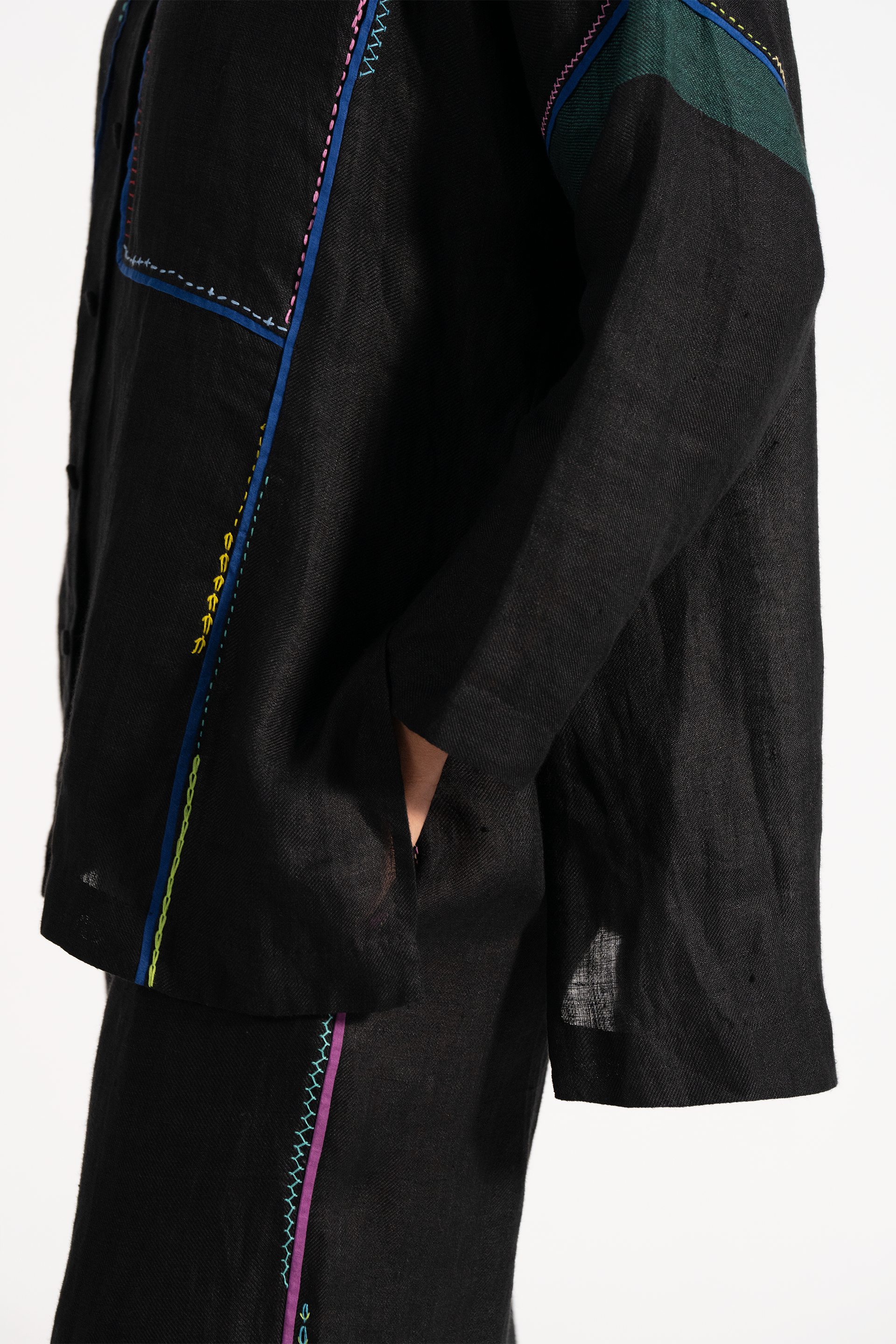 High Low Hem Relaxed Fit Shirt With Multicolor Delicate Hand Stitch Detail In 100% Linen.