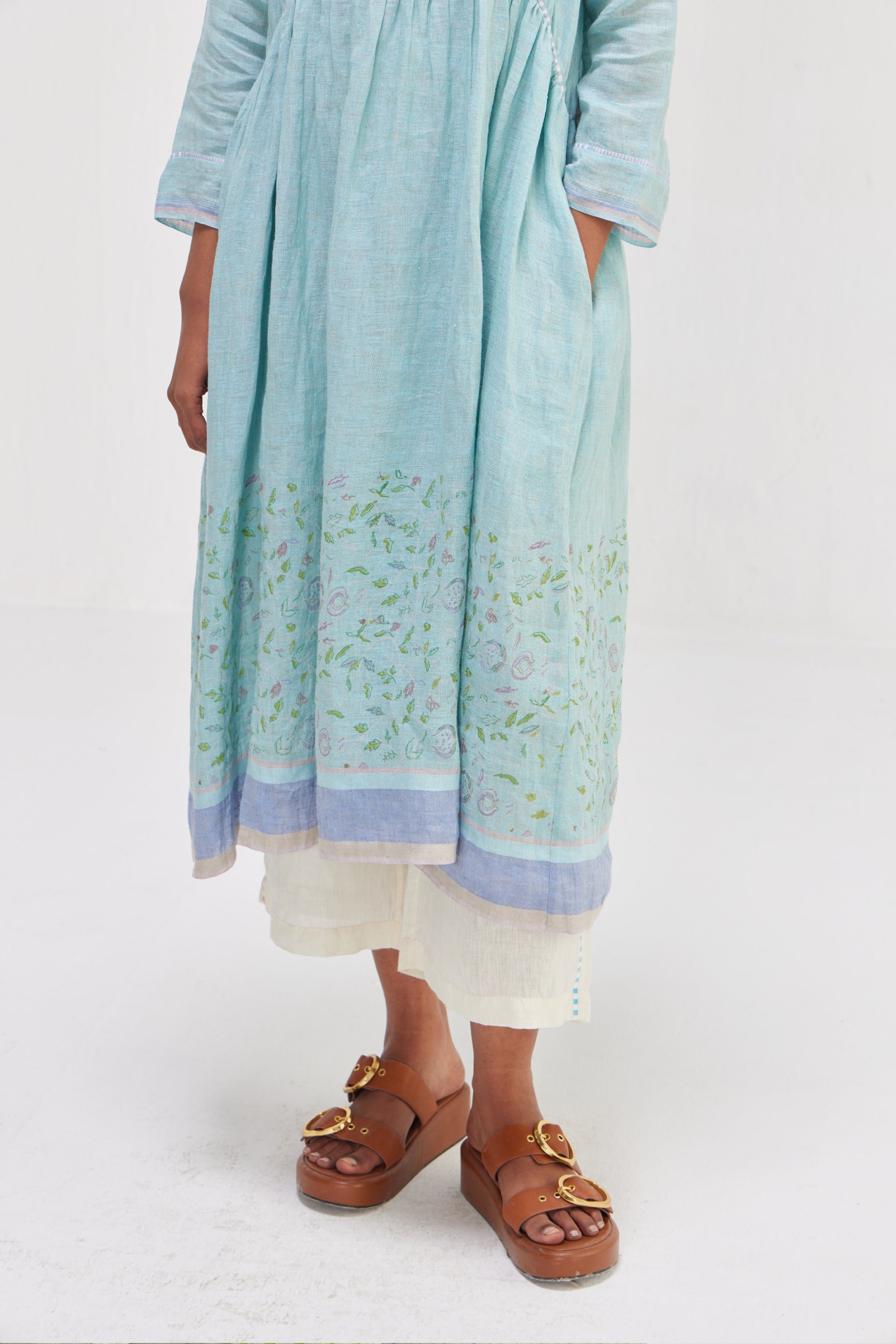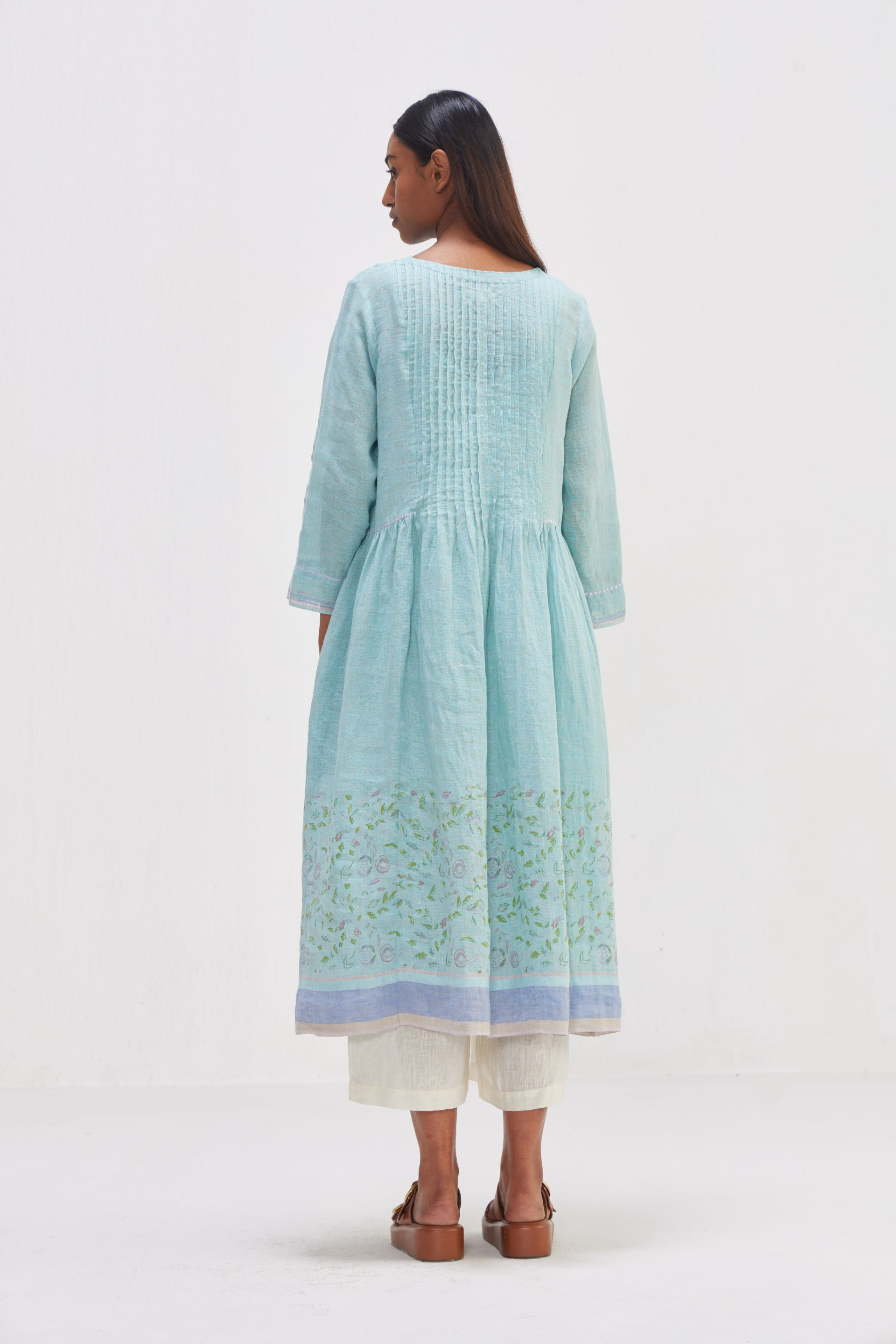 Midi dress featuring all-around pin-tucks for a tailored yet relaxed fit. Adorned with a border hand block floral print and contrast printed piping detail. Complete with selvedge in the hem for a polished finish.