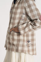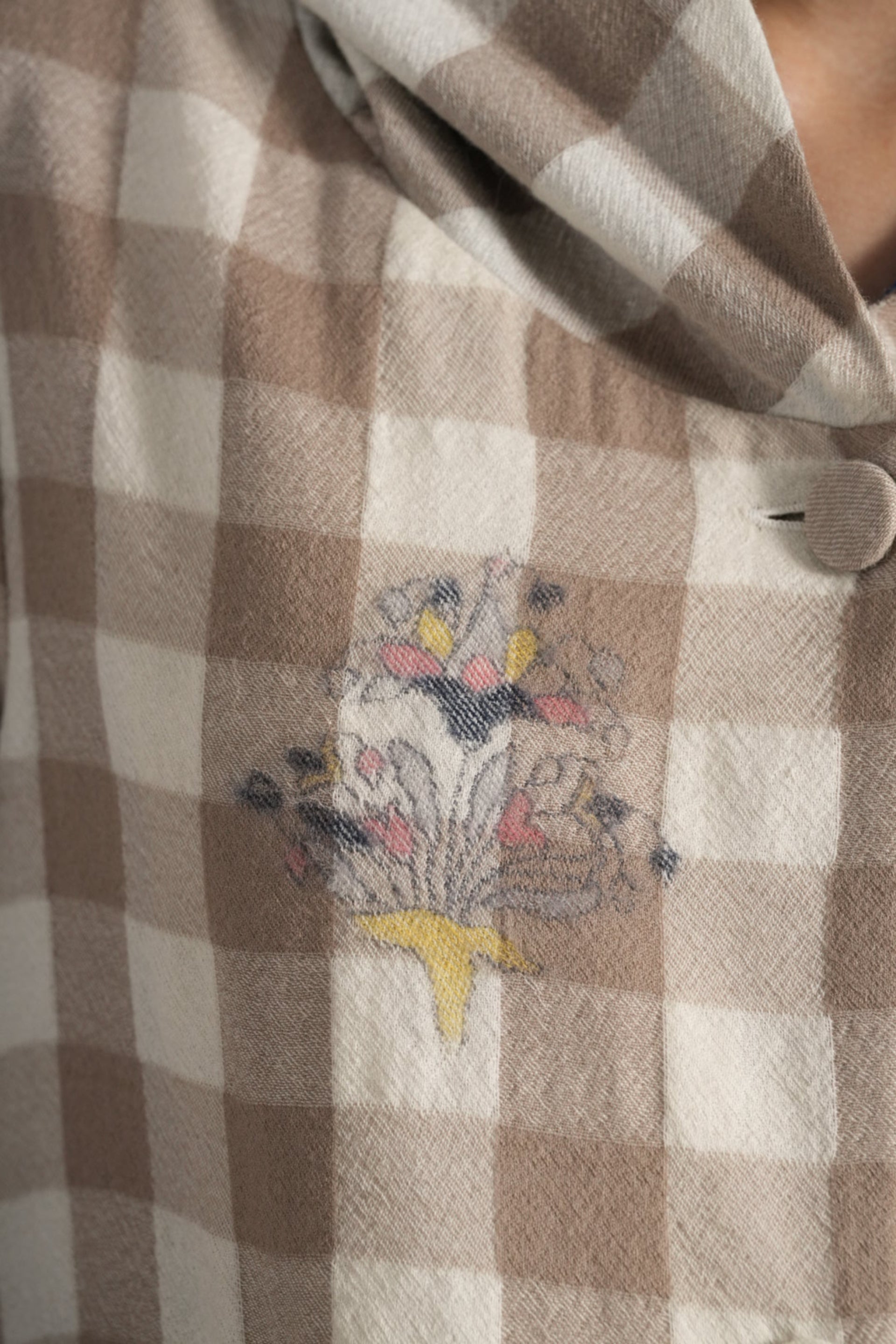 Button Down Hooded Jacket With Velt Pocket On Front Panel In Multicolor Self Checkered And Jacquard Floral Motifs 100% Merino Wool. Lined With Handblock Print 100% Silk.
