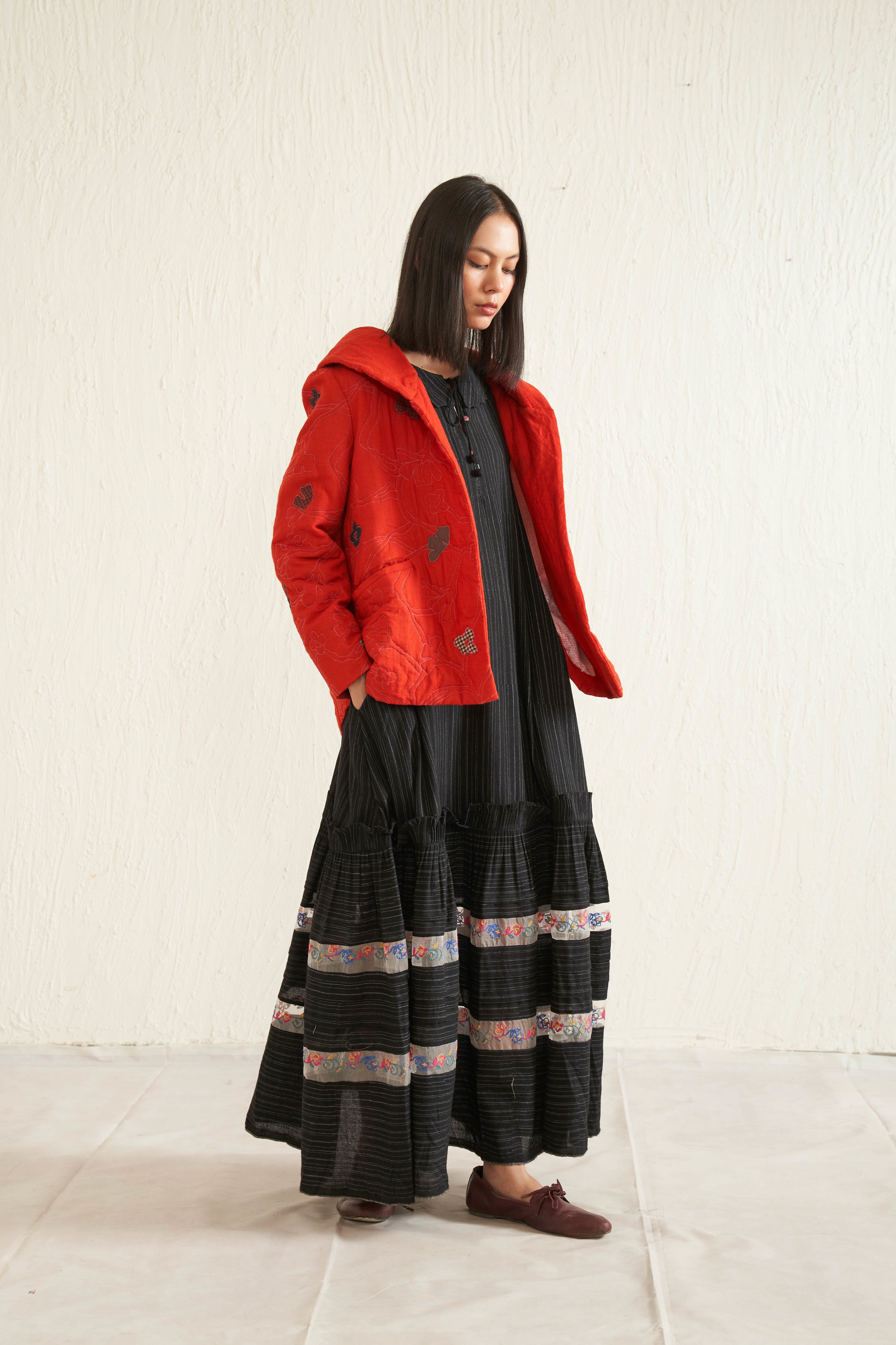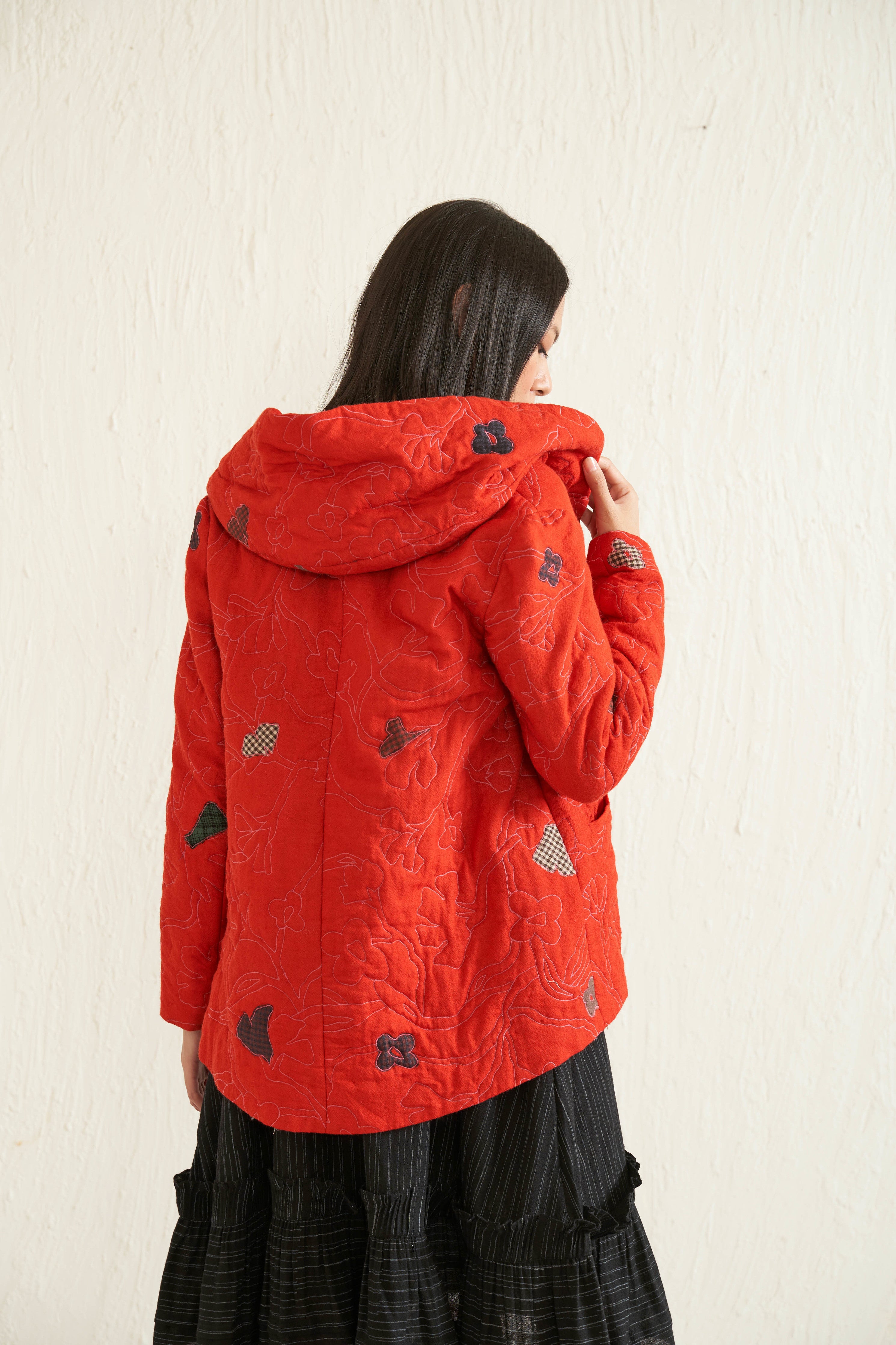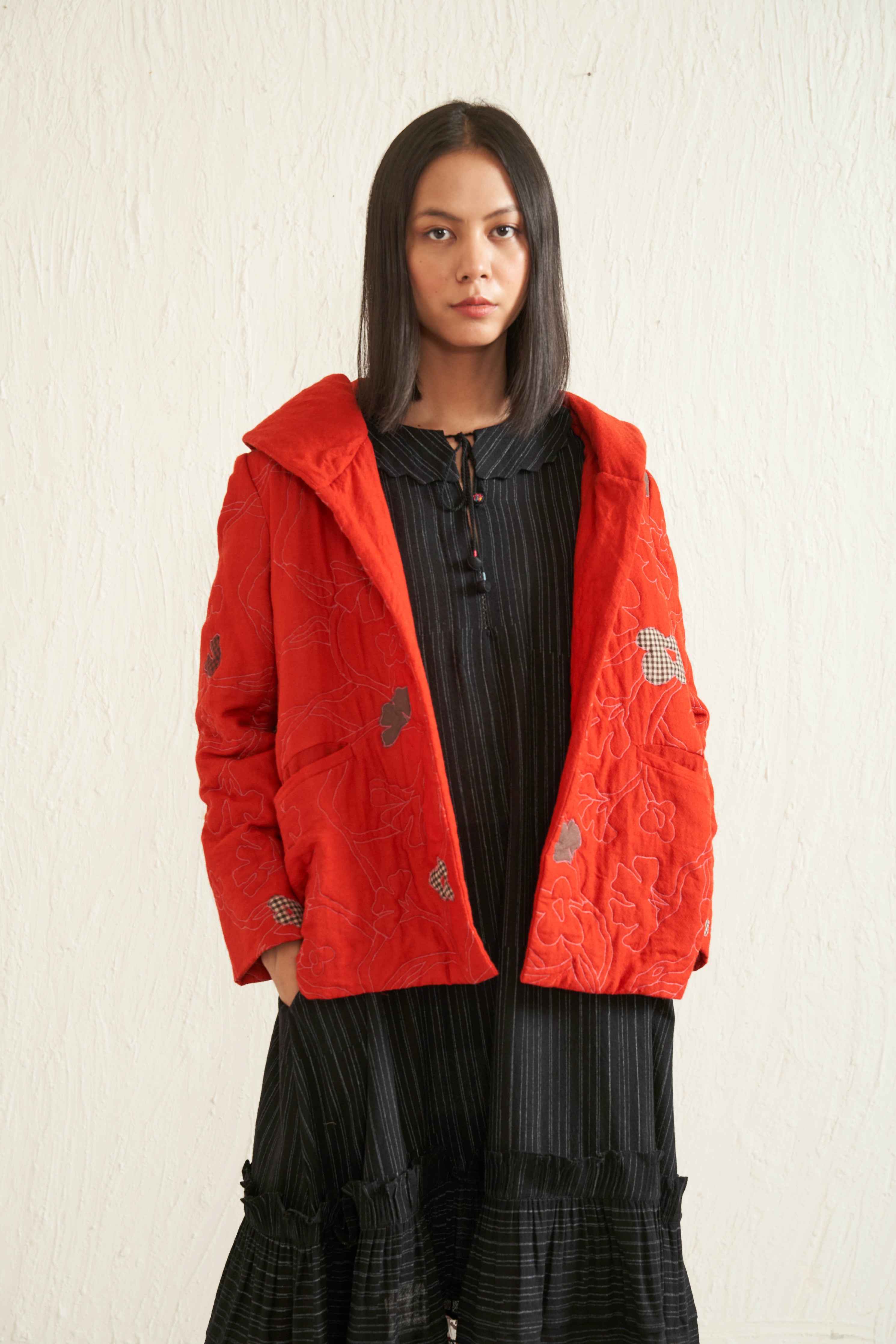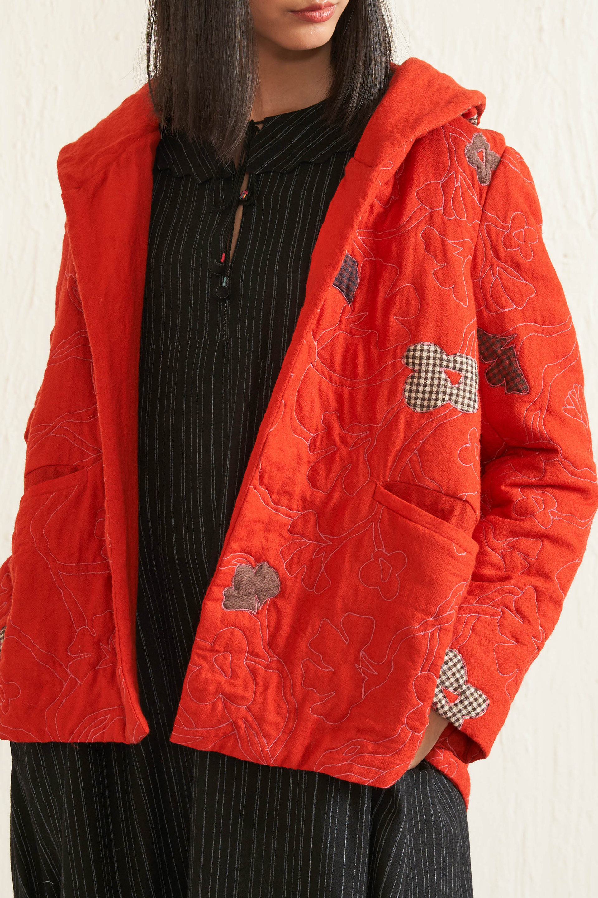 Red applique embroidered quilted jacket in pure merino wool. Comes with a zig-zag striper printed pure silk lining