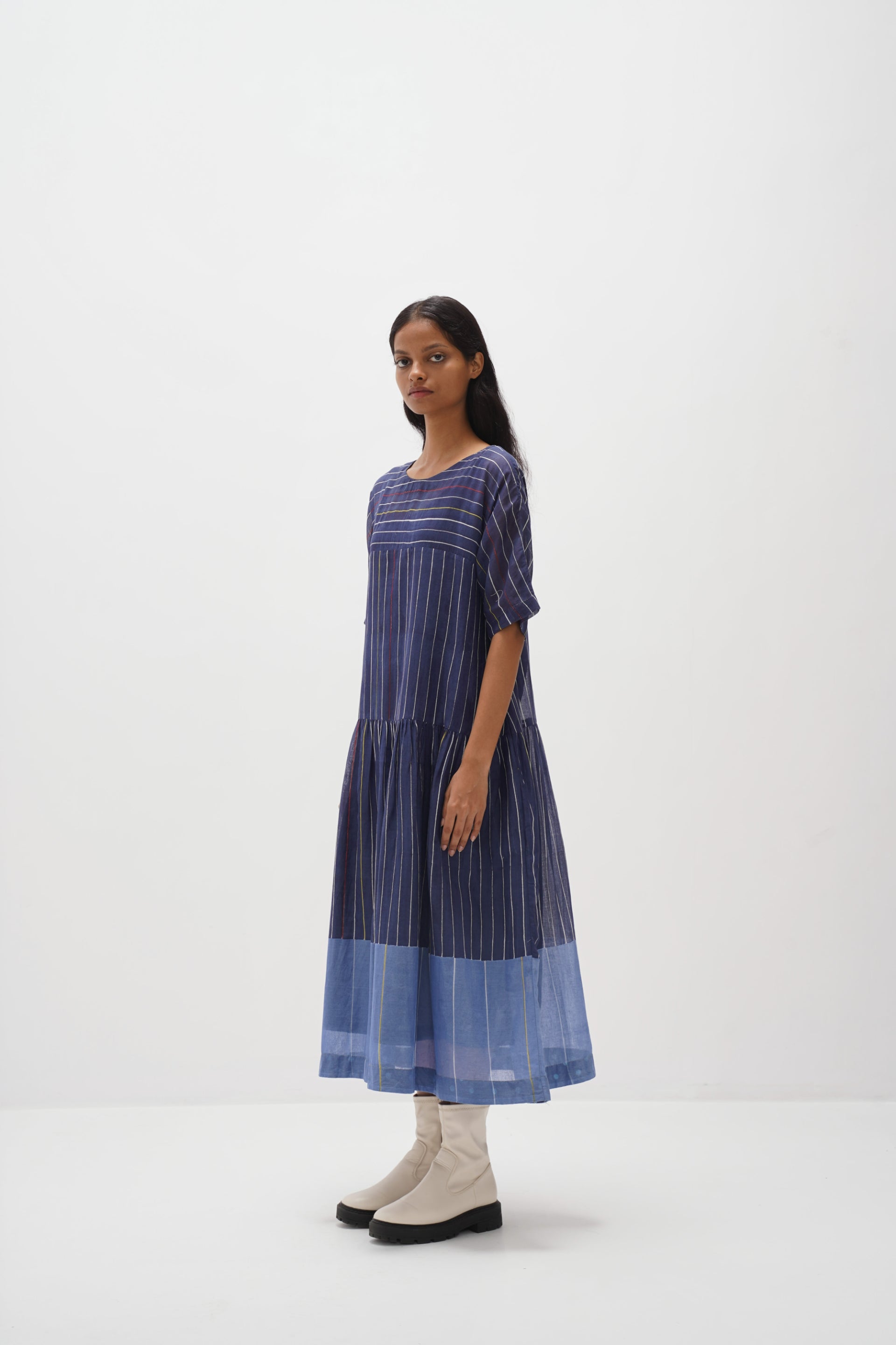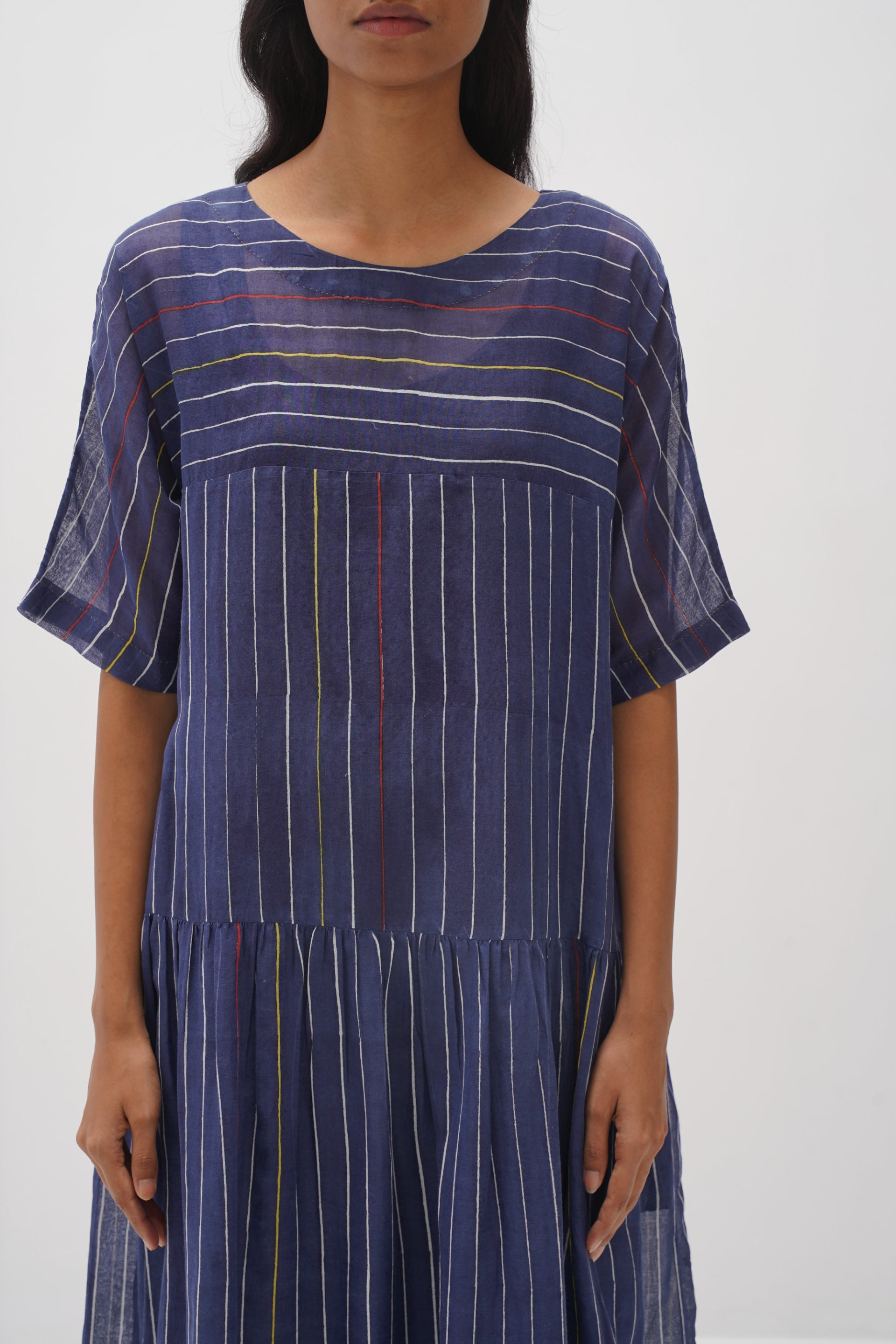 Midi dress with gathers on low waist seam featuring an all-over hand-blocked multi-stripes print, contrasting hand-blocked print panel design on hem. Button opening detail at the back.
