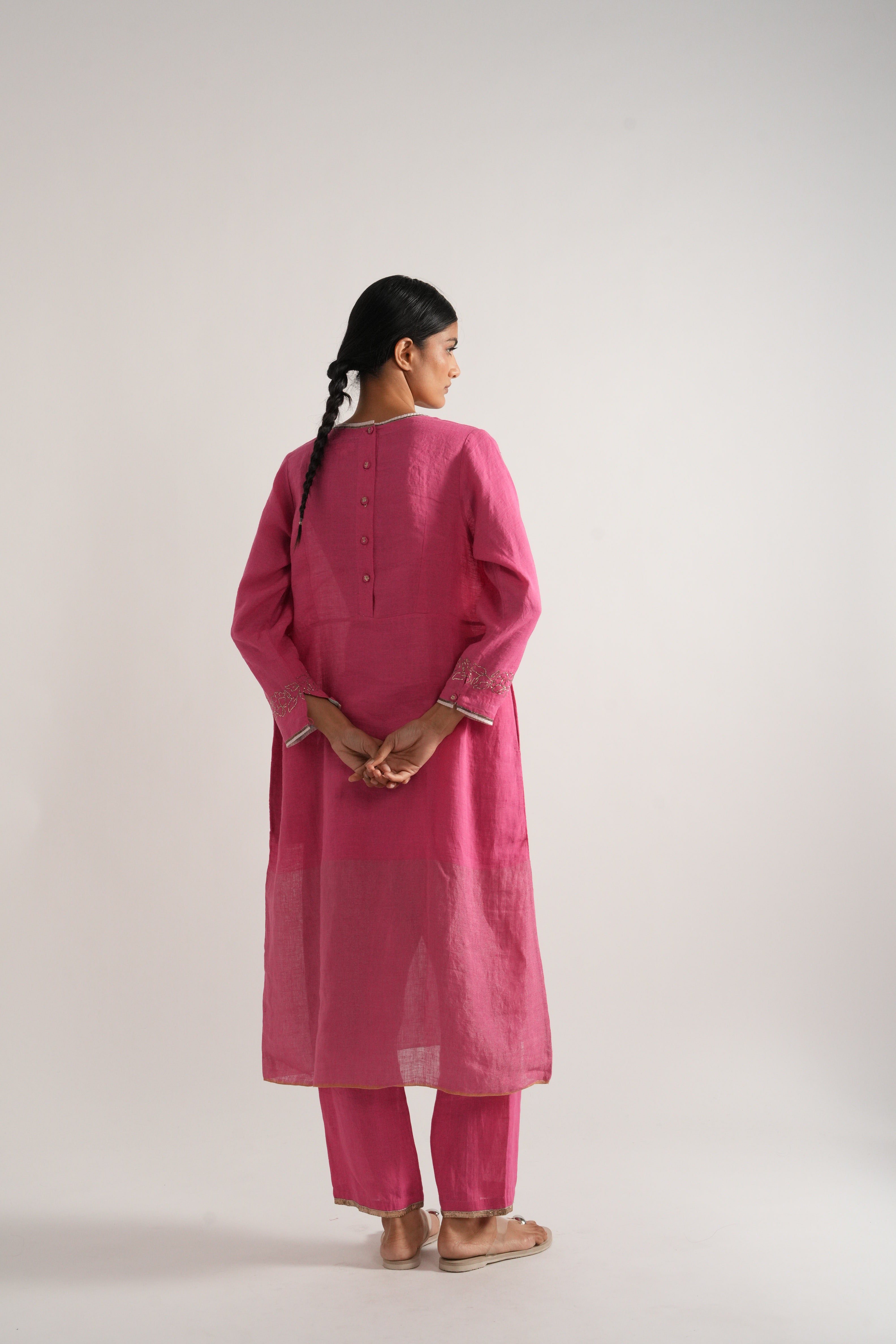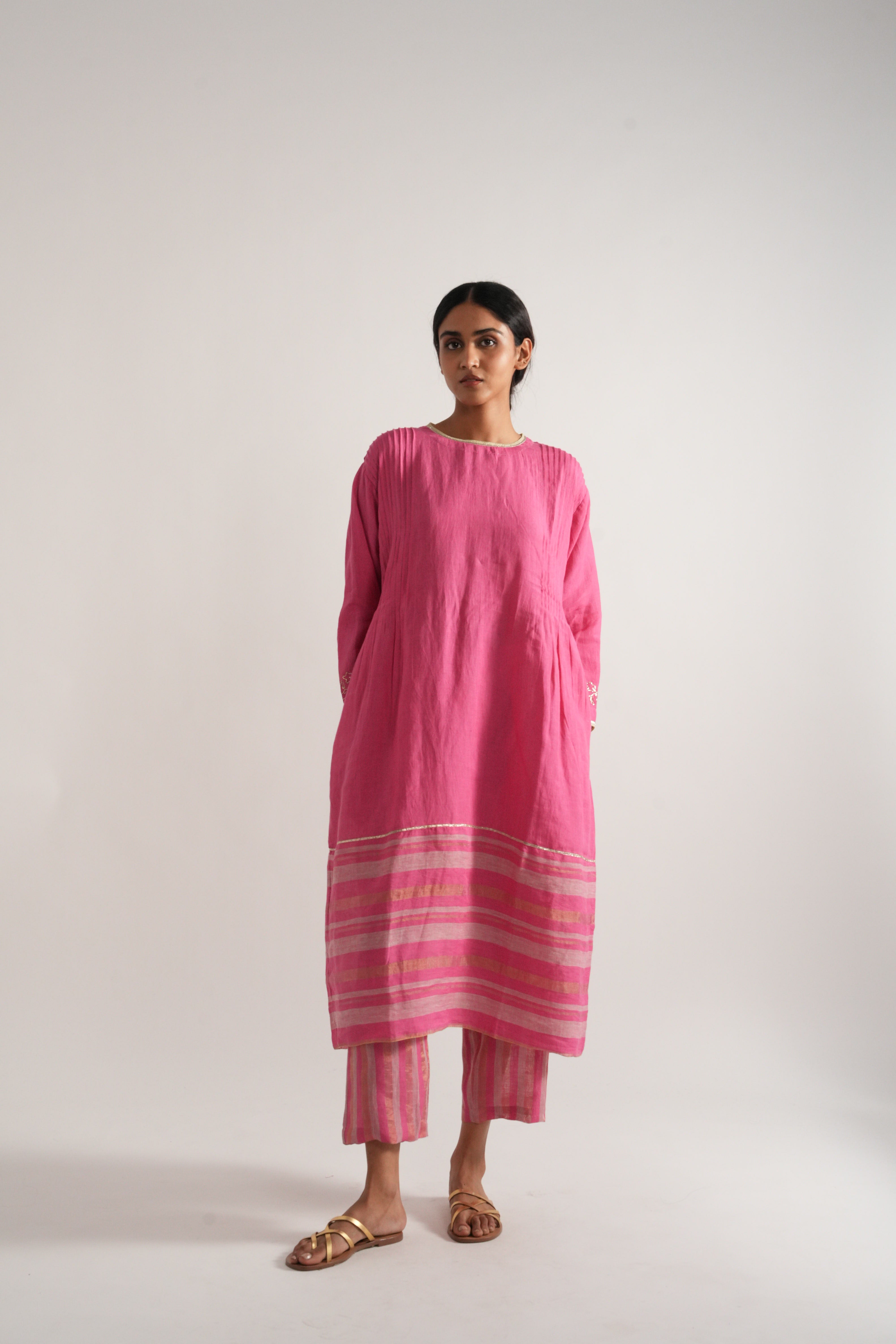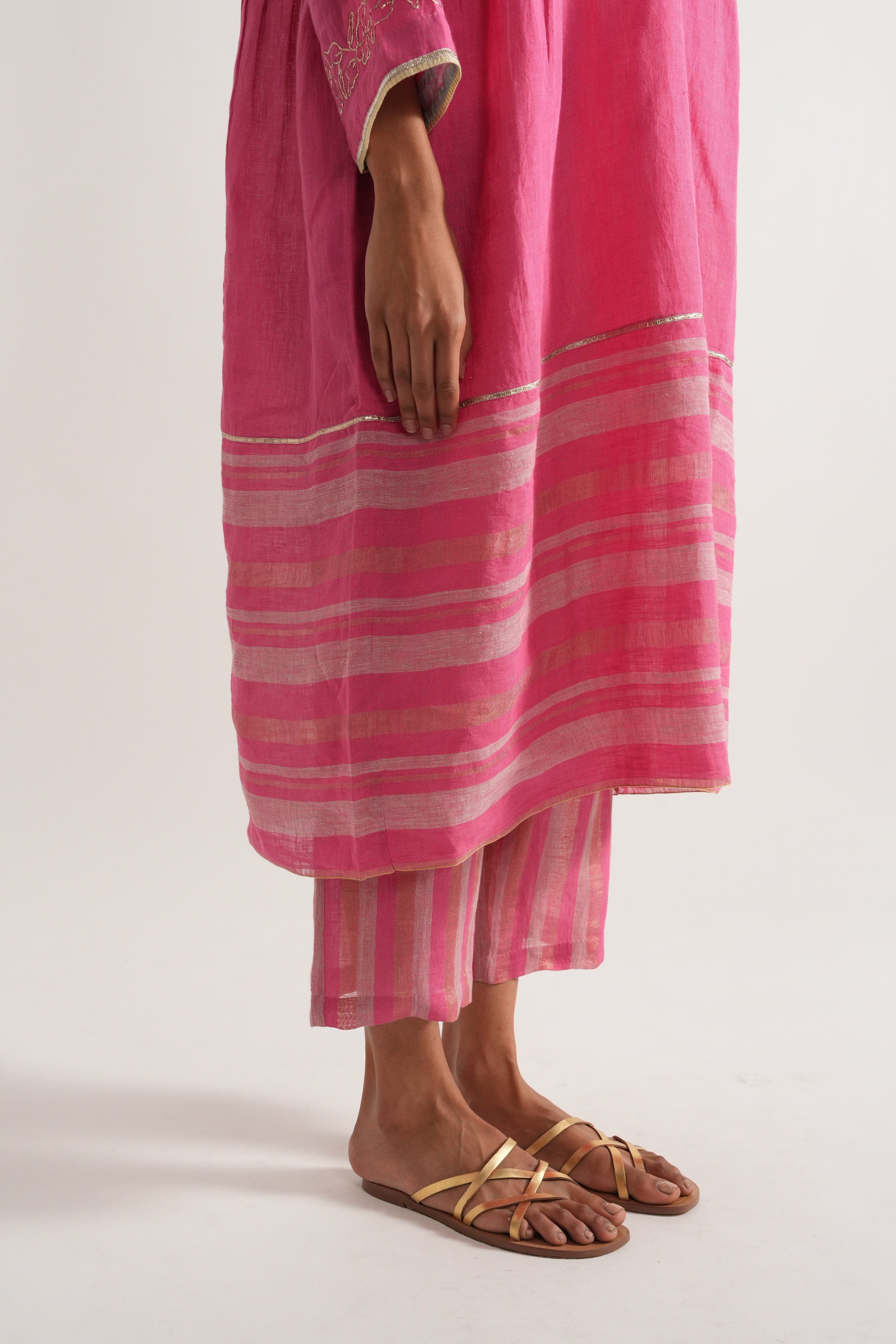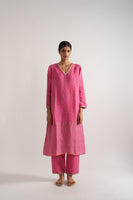 V neck midi length kurta dress in pink guze with contrasting selvage detail paired with straight fit pants