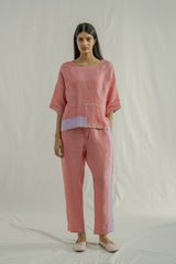 Relaxed fit boat neckline top with drop shoulder detail and hand-block print striper piping insert and applique detail . Constructed in solid 100% linen fabric.