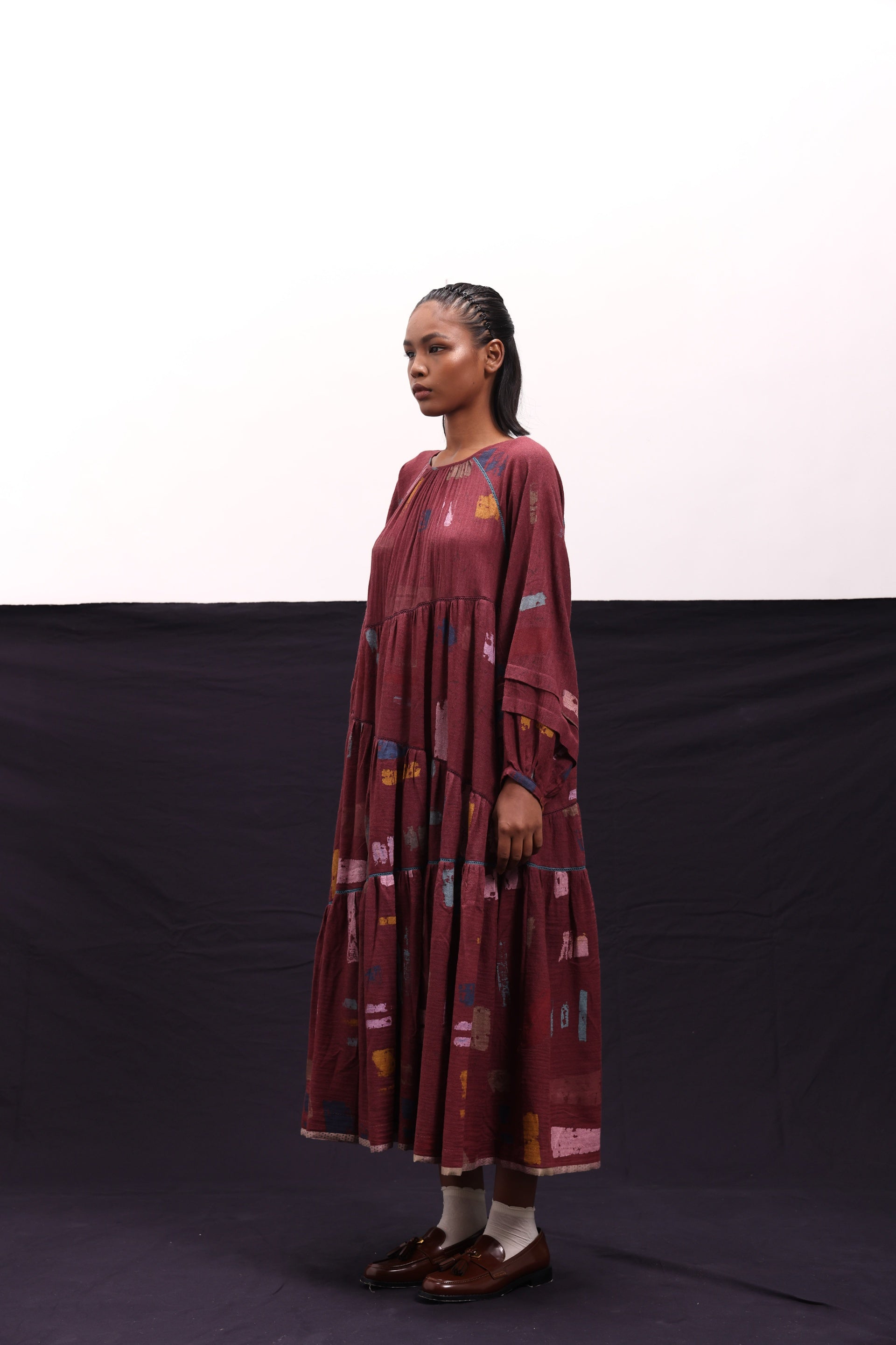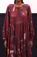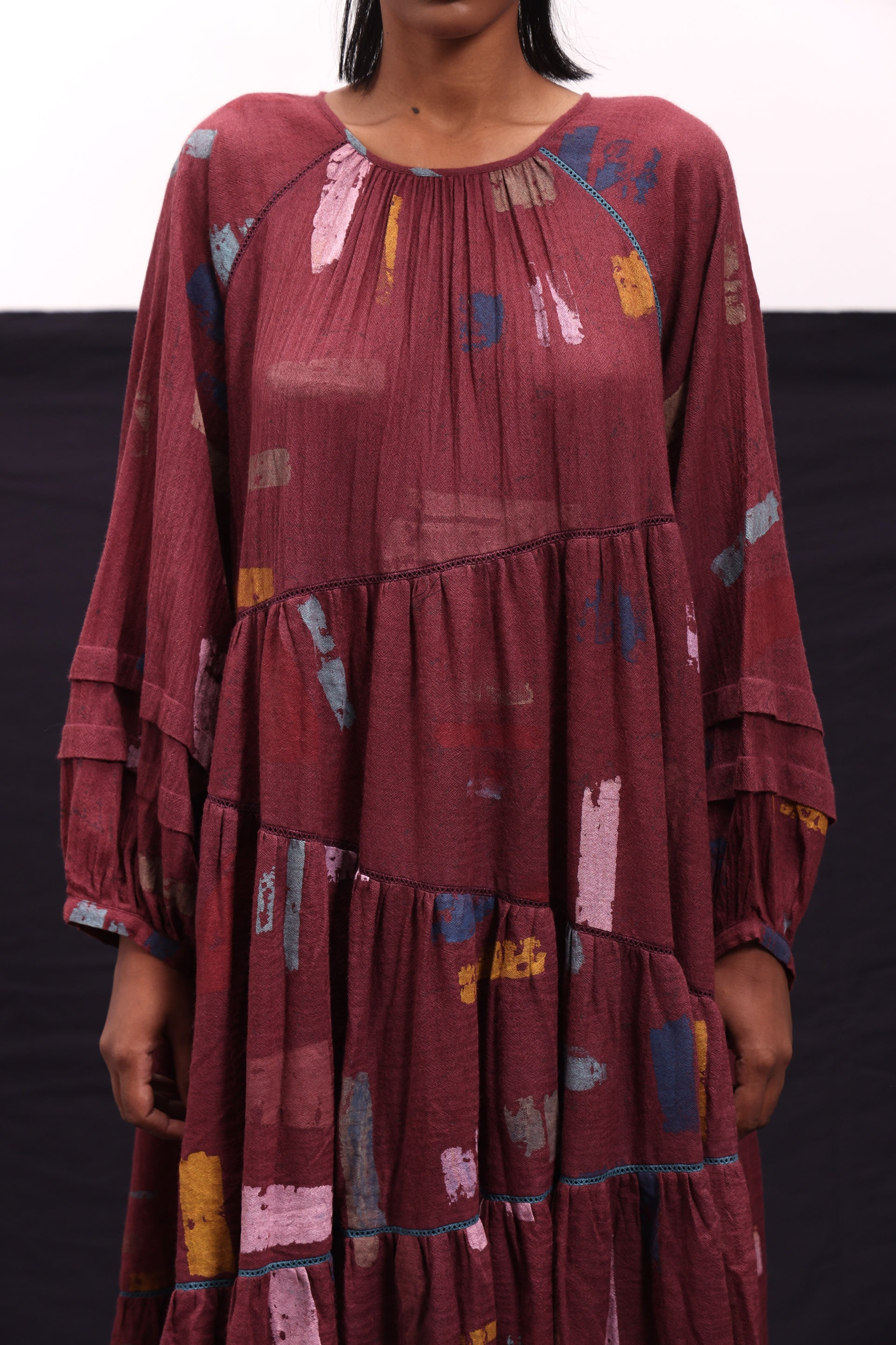 Midi dress constructed in abstract blocks print with criss - cross lace inserts