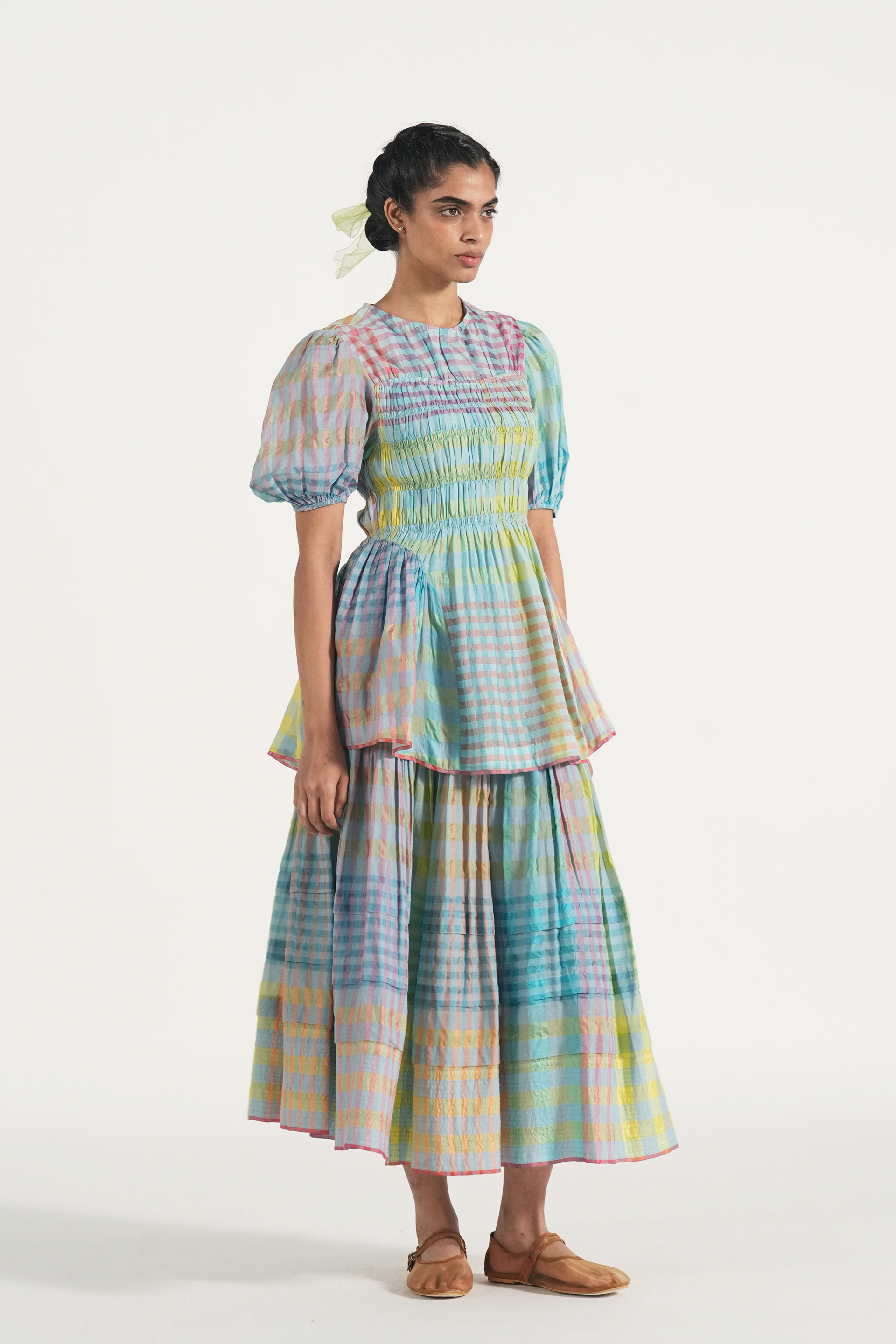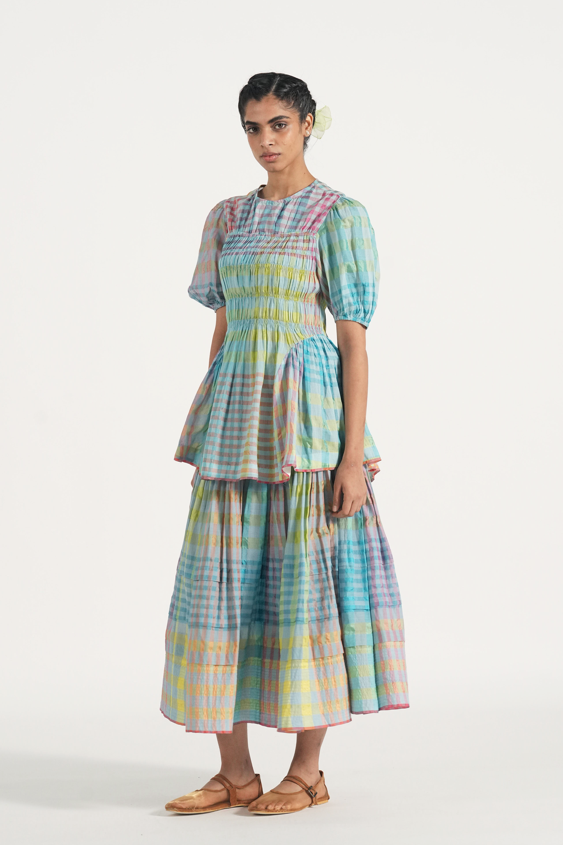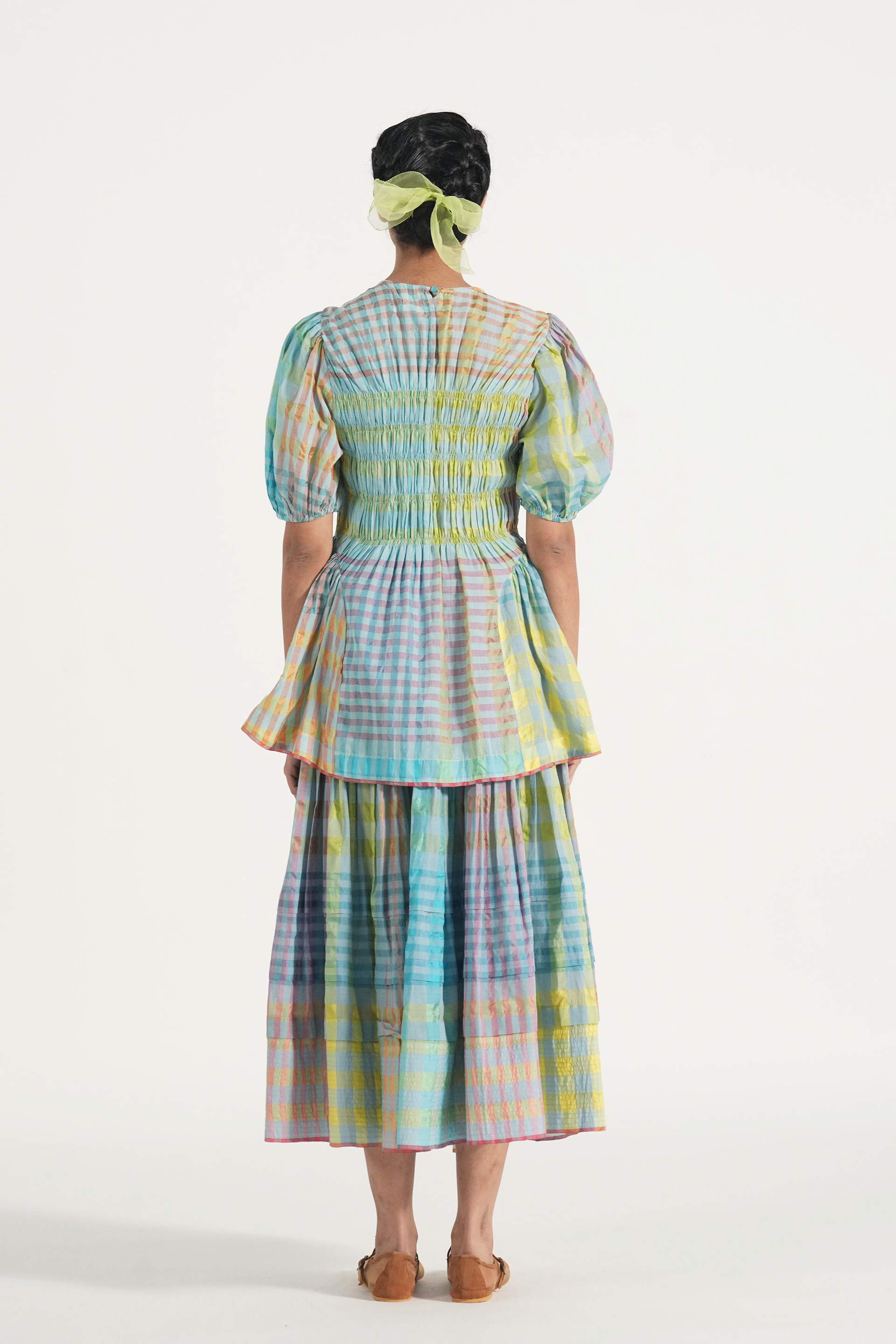Rouched midi skirt in multicolor handwoven cotton silk checks with contrast selvage